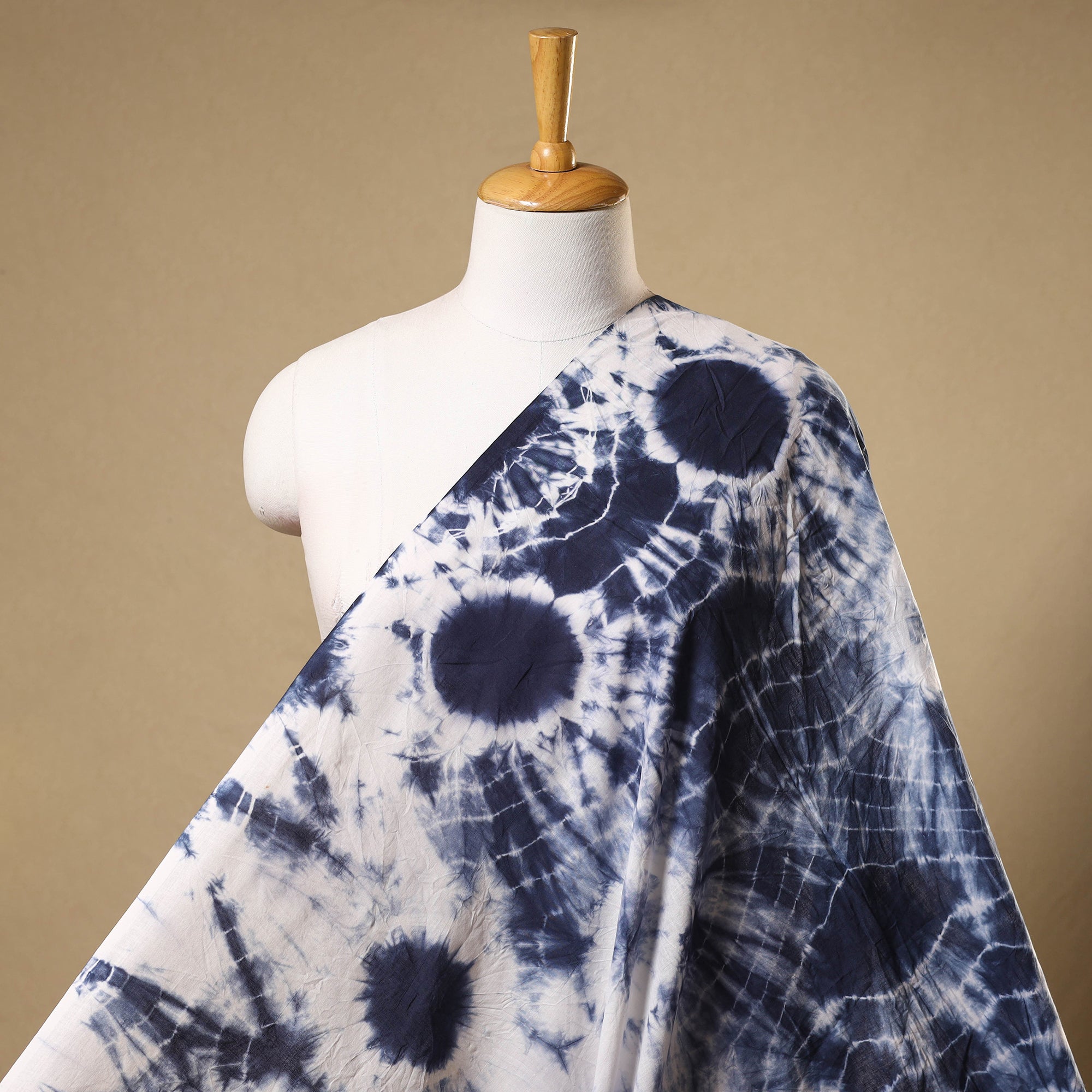 This blue cotton shibori fabric is hand-dyed using traditional tie-dye techniques, where the fabric is tied with threads or clamps to create beautiful patterns. The soft, breathable cotton makes it ideal for stylish kurtas, dresses, scarves, or even home decor.
