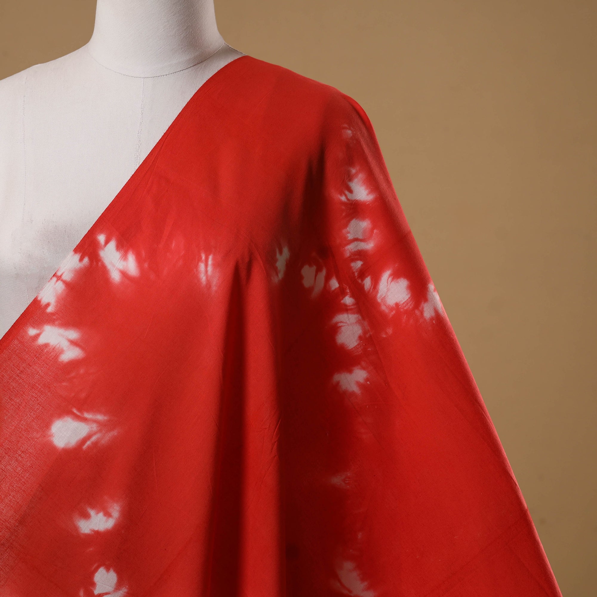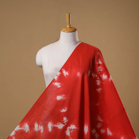 Red pure cotton shibori fabric is made using the traditional tie-dye method, where parts of the cloth are tied or clamped before dyeing to create beautiful patterns. Each piece is slightly different, showing the charm of handmade work. The soft and breathable cotton makes it great for making kurtas, dresses, dupattas, or even unique home decor items.