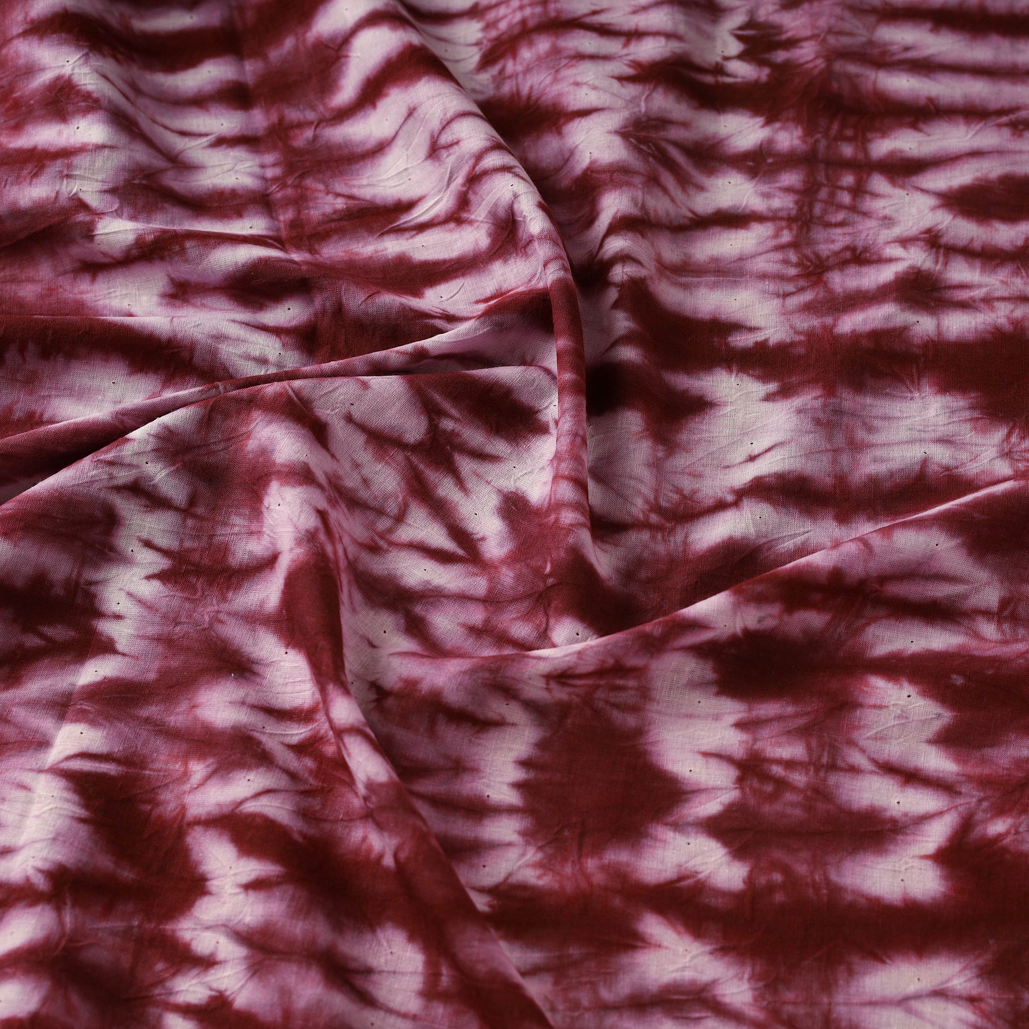 This maroon cotton shibori fabric is hand-dyed using traditional tie-dye techniques, where the fabric is tied with threads or clamps to create beautiful patterns. The soft, breathable cotton makes it ideal for stylish kurtas, dresses, scarves, or even home decor.