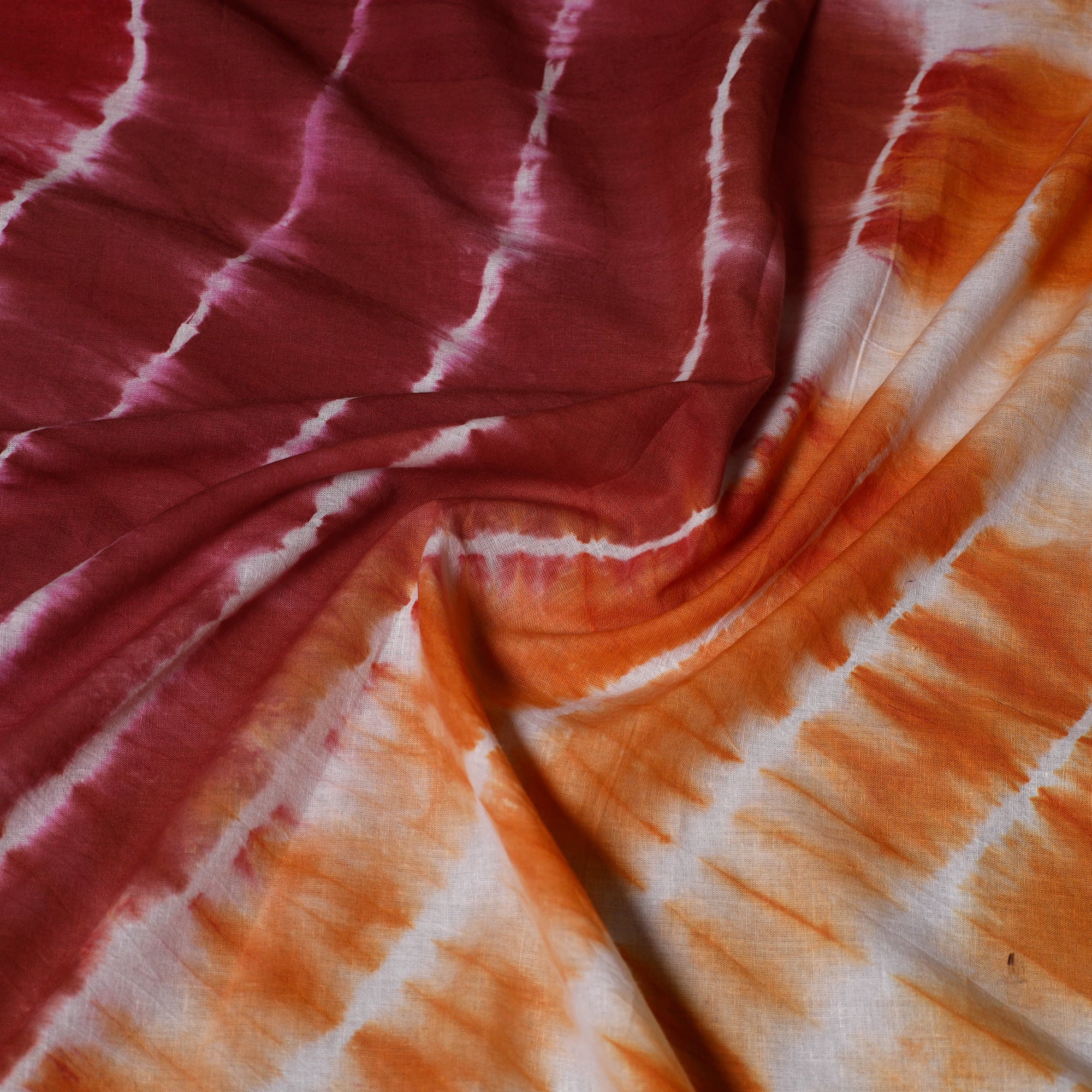 This maroon cotton shibori fabric is hand-dyed using traditional tie-dye techniques, where the fabric is tied with threads or clamps to create beautiful patterns. The soft, breathable cotton makes it ideal for stylish kurtas, dresses, scarves, or even home decor.