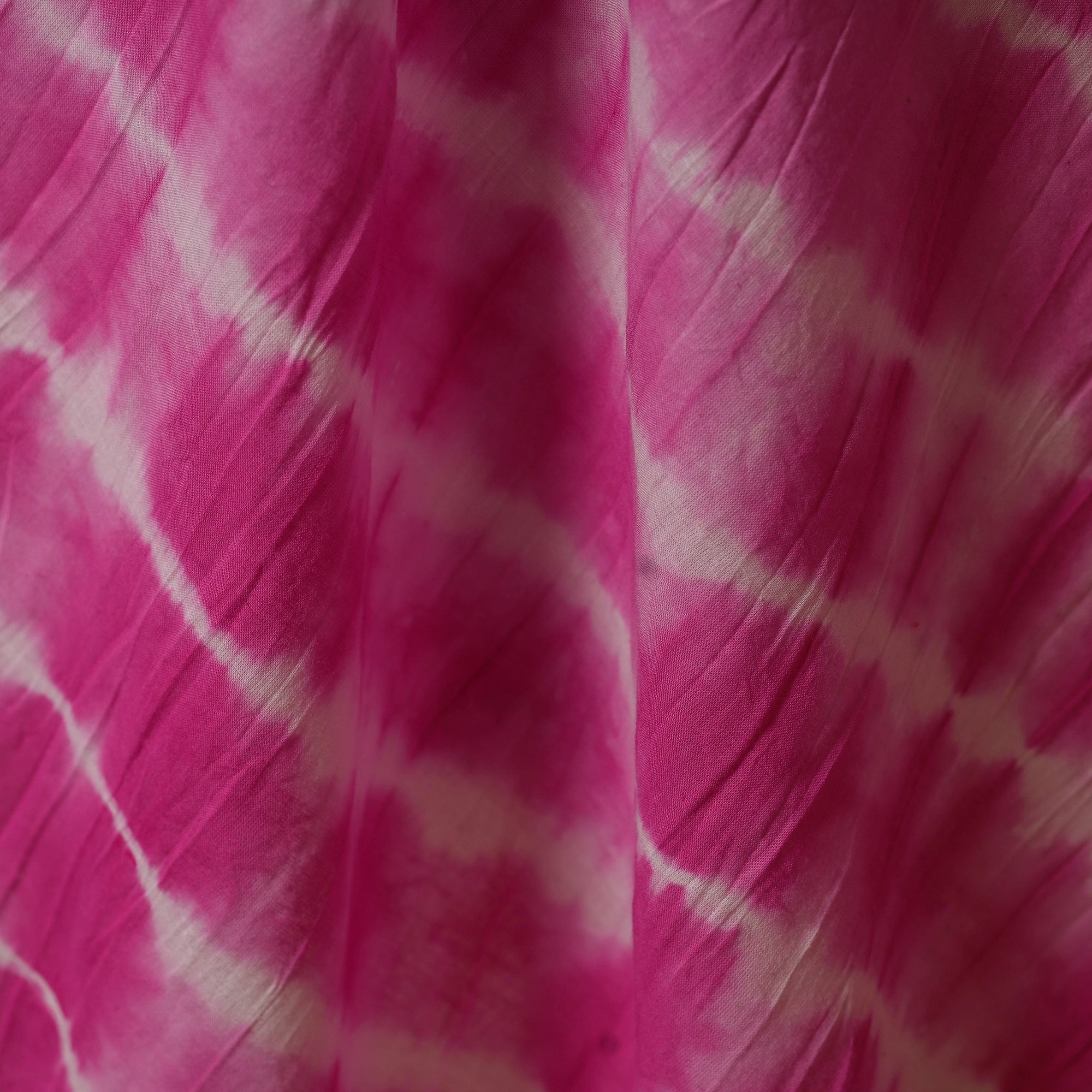 Pink pure cotton shibori fabric is made using the traditional tie-dye method, where parts of the cloth are tied or clamped before dyeing to create beautiful patterns. Each piece is slightly different, showing the charm of handmade work. The soft and breathable cotton makes it great for making kurtas, dresses, dupattas, or even unique home decor items.