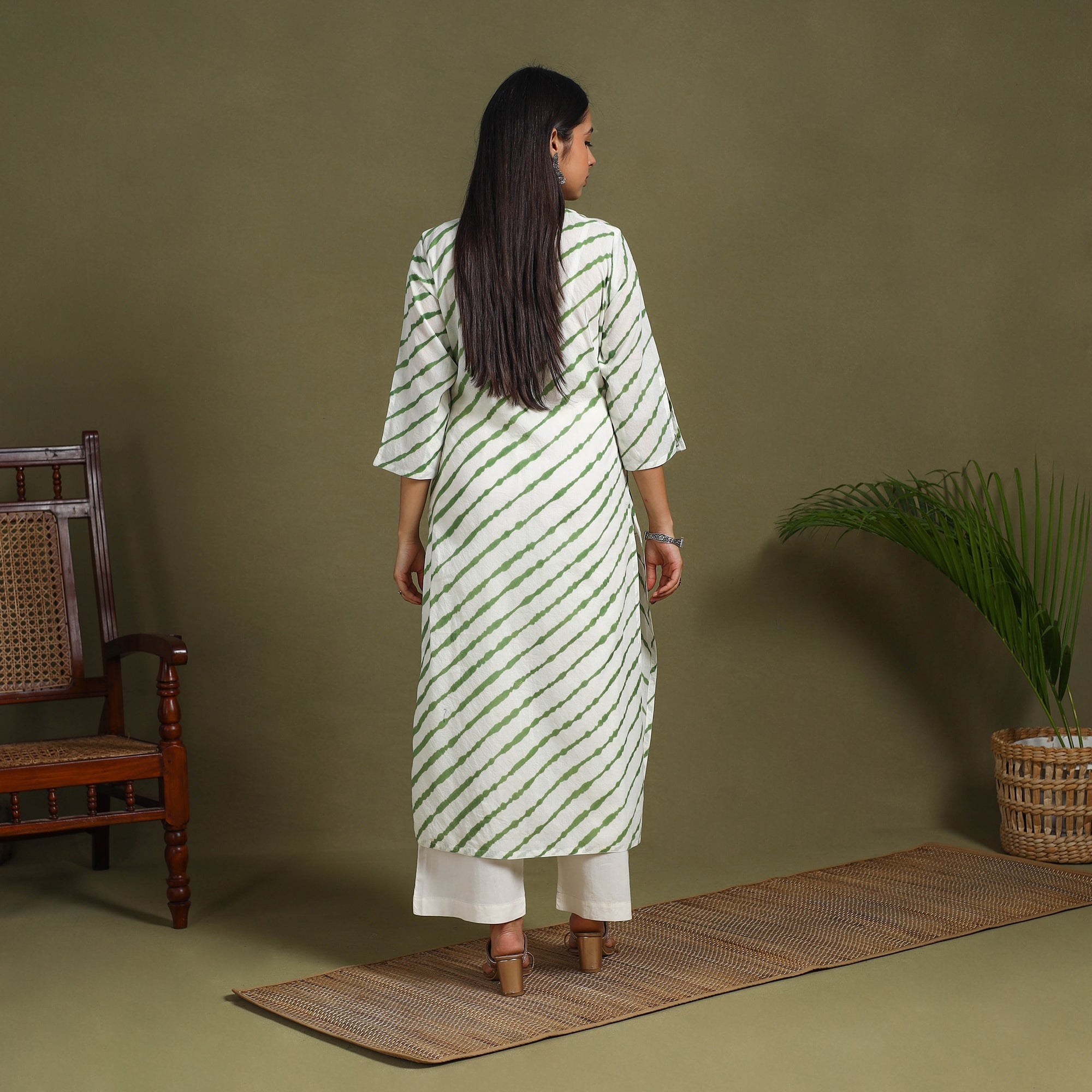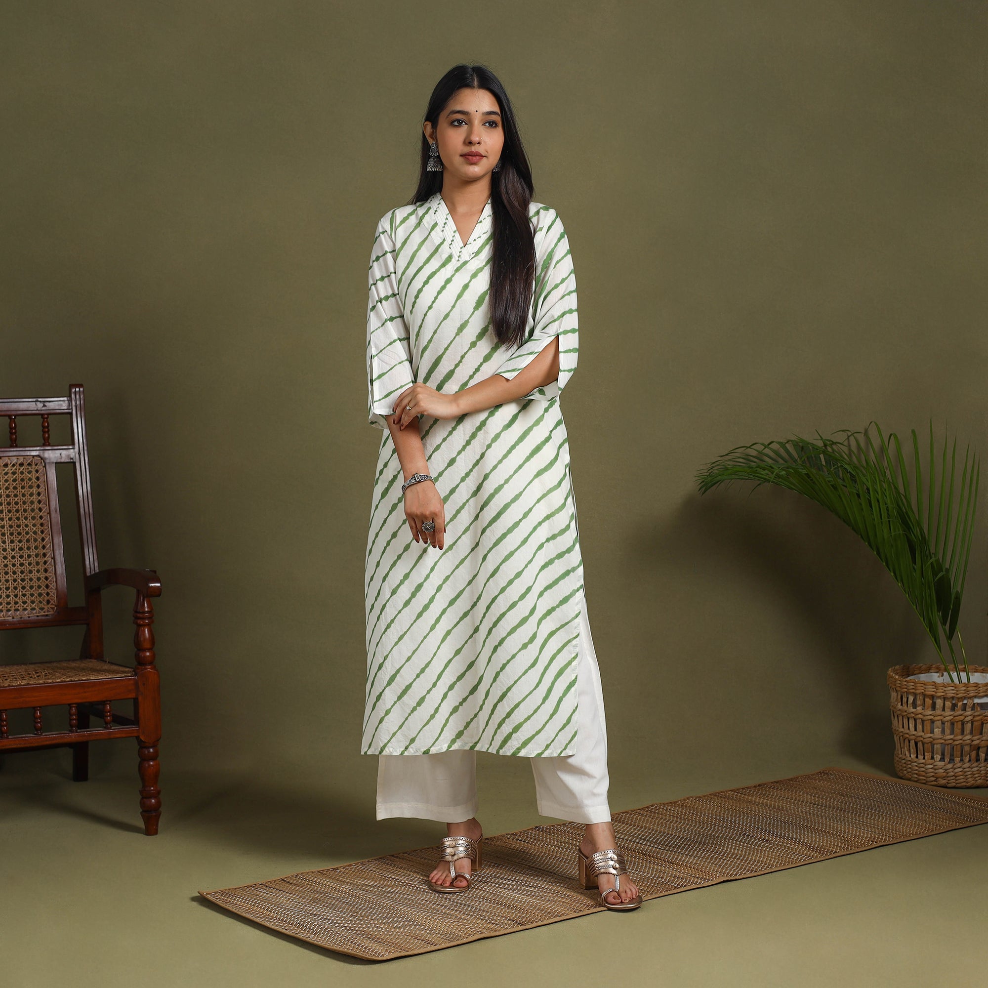 This cotton straight leheriya kurta is hand-dyed by skilled artisans from Rajasthan, using the traditional tie-dye technique. Its vibrant wavy patterns offering a gentle texture and refined look with a relaxed fit and a single one-side pocket, it’s a comfortable choice for everyday wear or festive occasions.