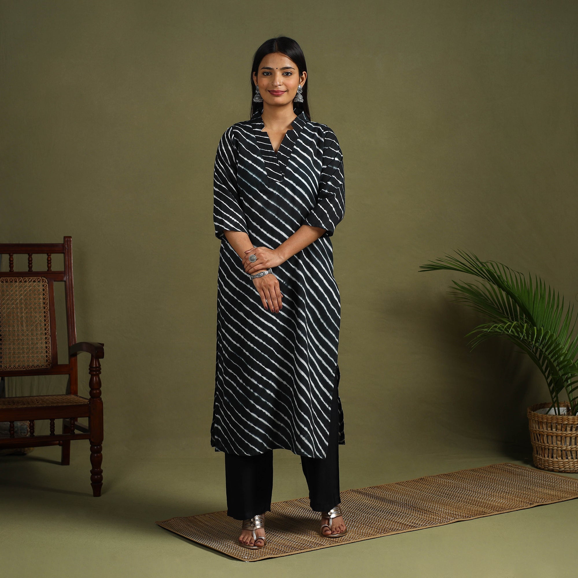This straight black leheriya kurta is a stunning blend of tradition and elegance. Leheriya, a traditional tie-dye technique from Rajasthan, is known for its vibrant, wavy patterns created by skilled artisans. This kurta features a practical side pocket, adding both style and functionality, it a perfect choice for festive and casual occasions.