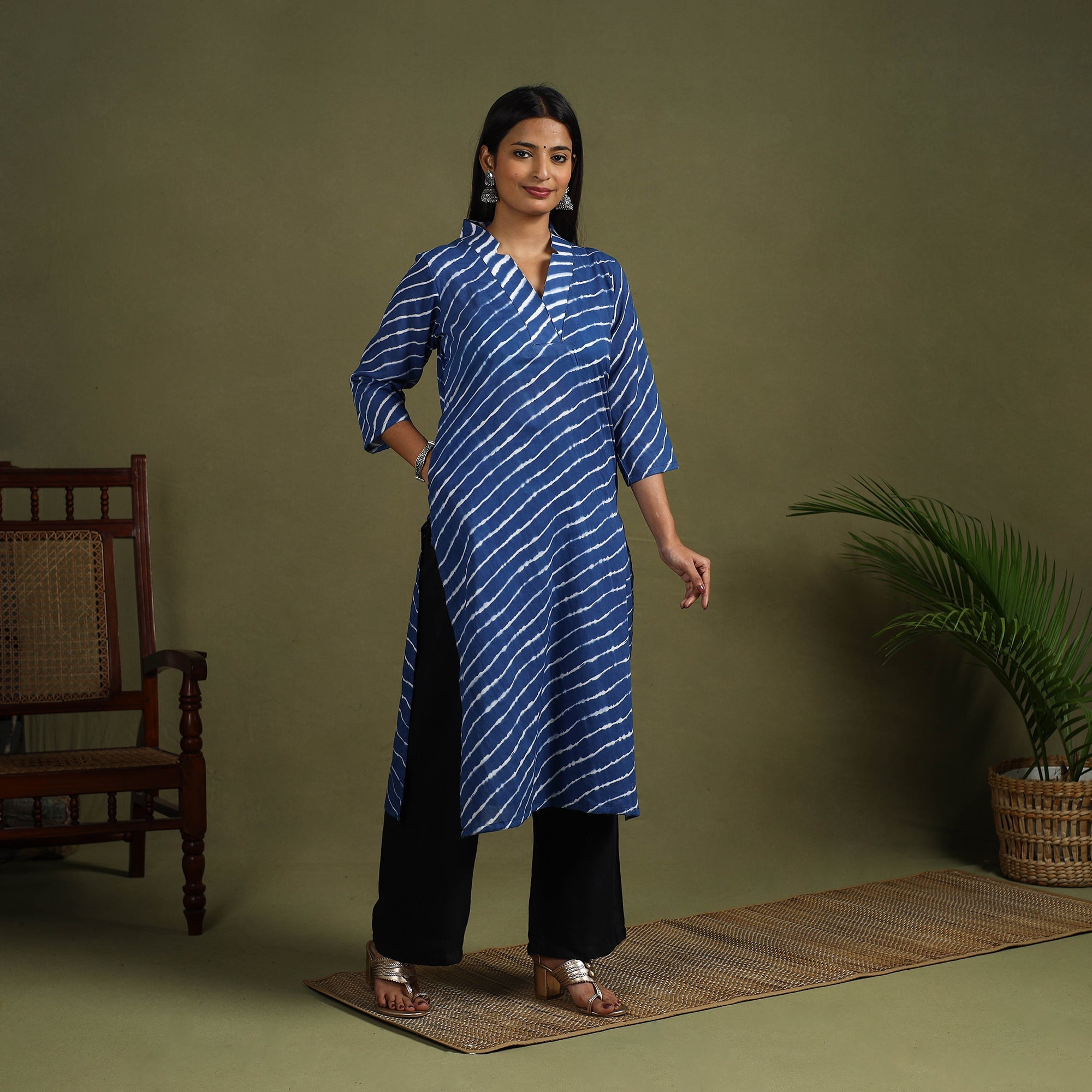 This straight blue leheriya kurta is a stunning blend of tradition and elegance. Leheriya, a traditional tie-dye technique from Rajasthan, is known for its vibrant, wavy patterns created by skilled artisans. This kurta features a practical side pocket, adding both style and functionality, it a perfect choice for festive and casual occasions.