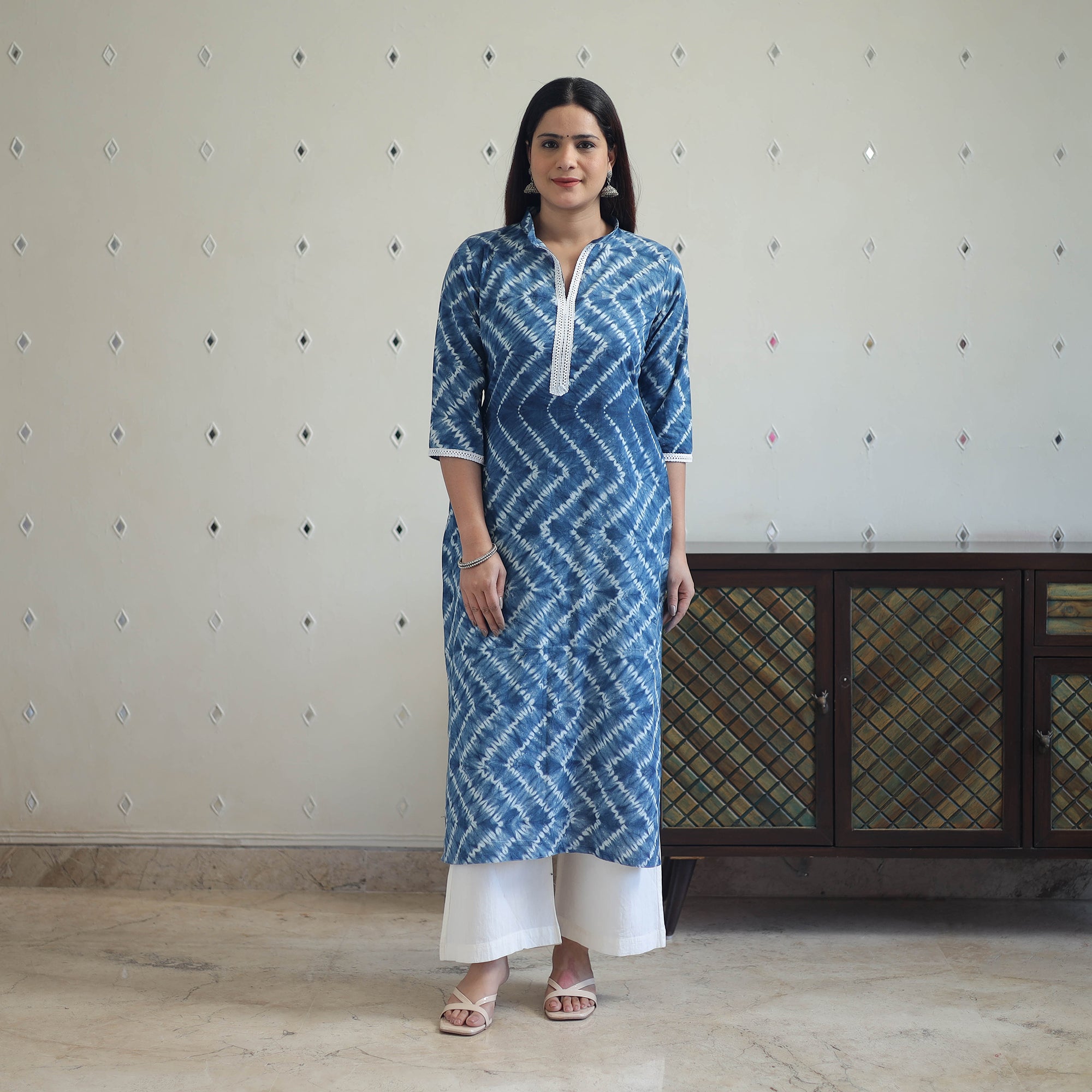 Embrace elegance with this blue tie & dye cotton straight shibori kurta with one side pocket and lace work. Featuring a unique pattern created using traditional techniques, this kurta combines comfort with artistic flair. Perfect for all-day wear making it ideal for both casual and semi-formal occasions.