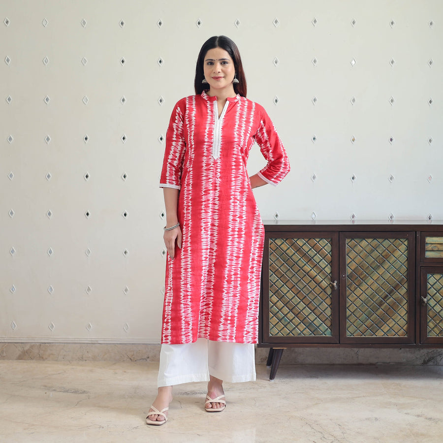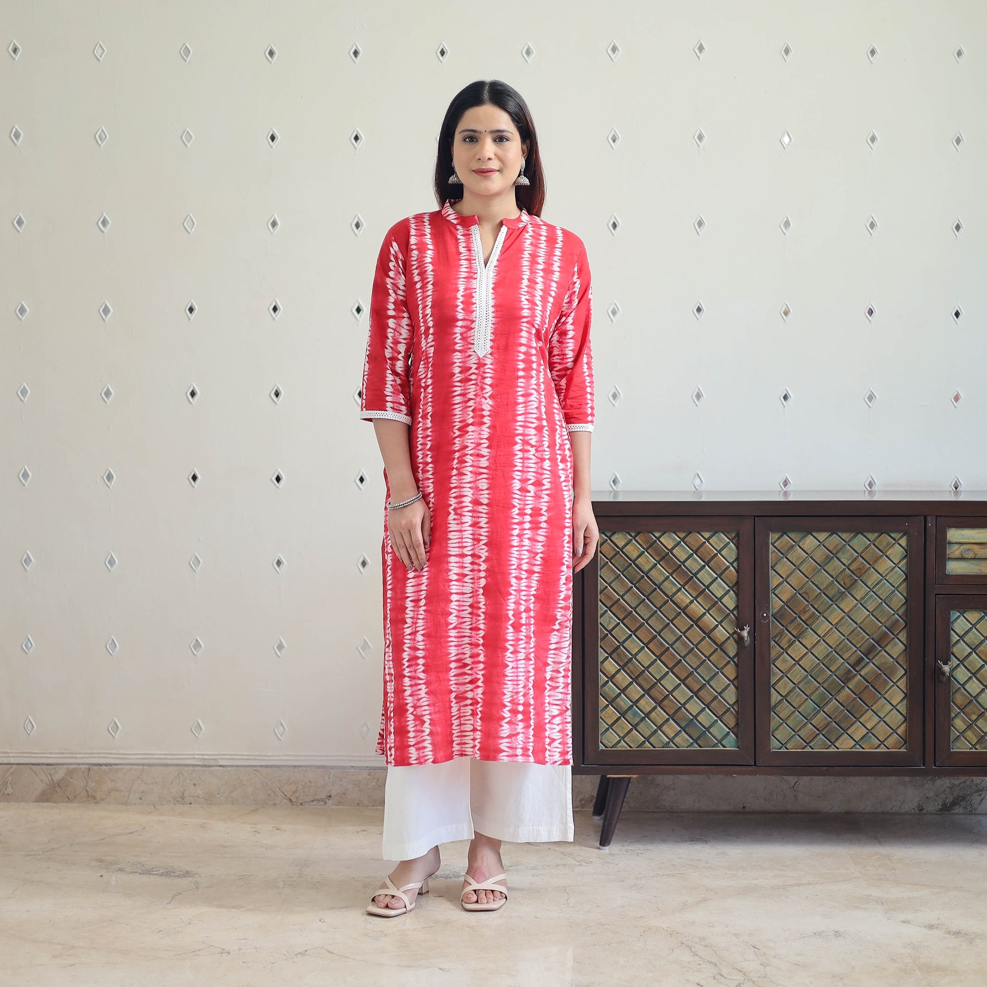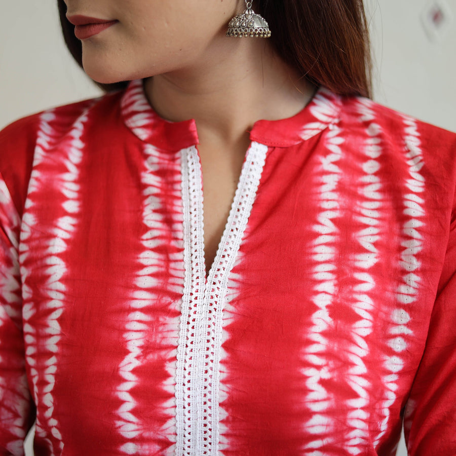 Embrace elegance with this red tie & dye cotton straight shibori kurta with one side pocket and lace work. Featuring a unique pattern created using traditional techniques, this kurta combines comfort with artistic flair. Perfect for all-day wear making it ideal for both casual and semi-formal occasions.