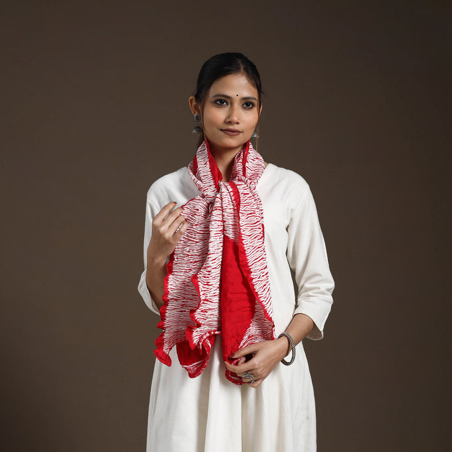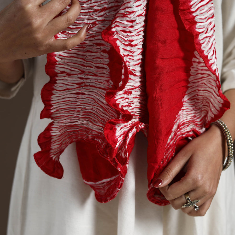 Wrap yourself in the red beauty shibori gajji silk stole. It is hand-dyed using the tie and dye technique, where the fabric is tied using a clamp or stitches in the desired design, and then dyed to create unique and intricate patterns. Soft, lightweight, and elegant, this shibori stole is perfect for adding a touch of elegance to any outfit.