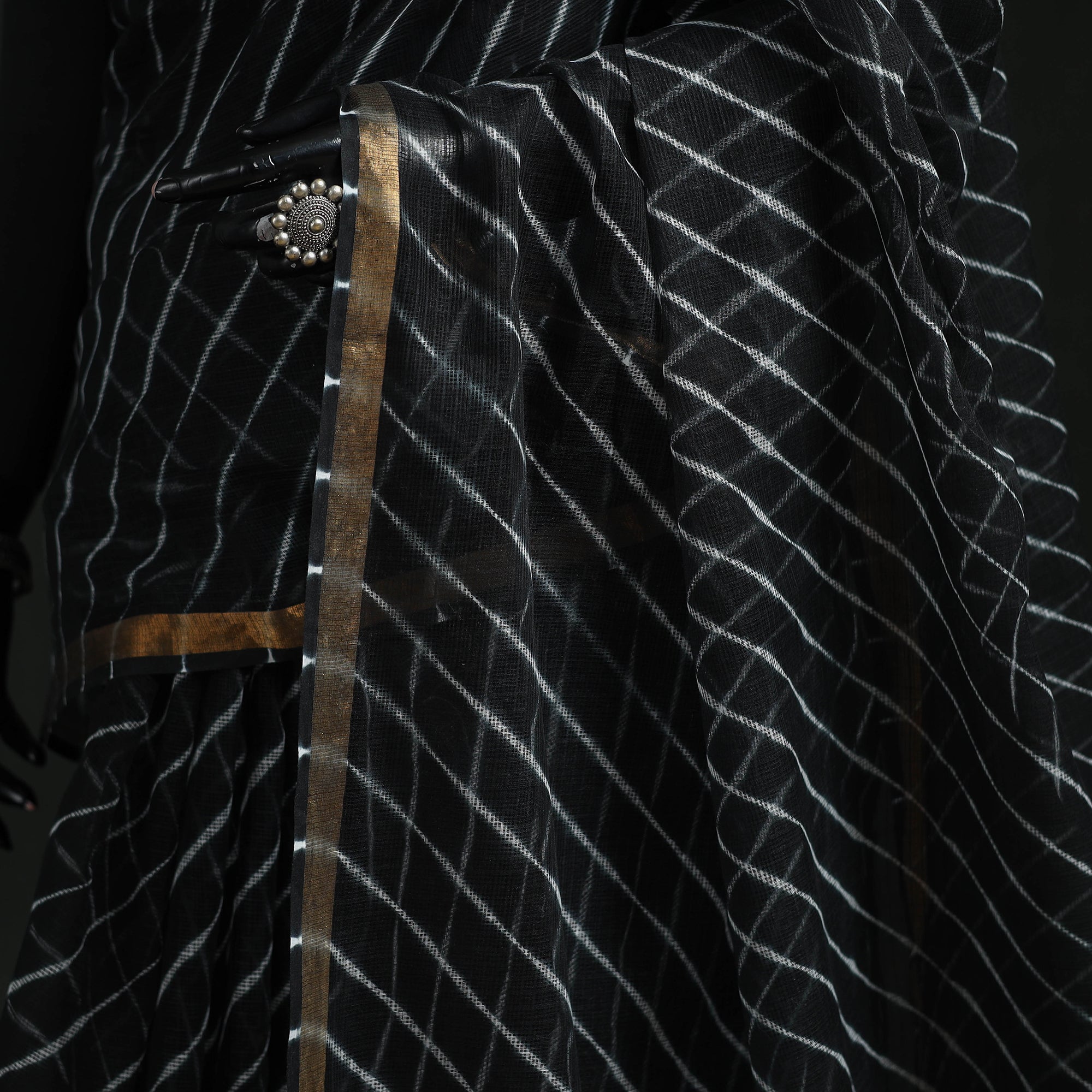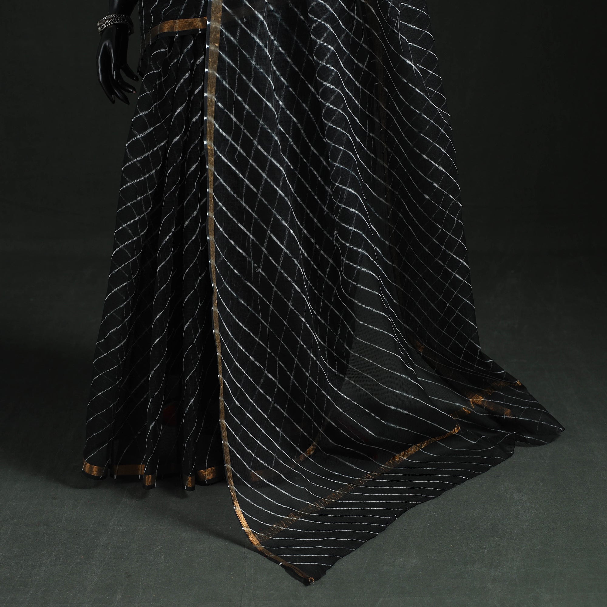 Leheriya kota doria cotton saree, crafted using Rajasthan tie-dye technique by master artisan Adil Hussain. Leheriya is a centuries-old dyeing tradition, believed to be over 300 years old, and is deeply rooted in Rajasthan’s cultural heritage. The lightweight and breathable kota doria saree, originating from the Kota district, features finely interwoven threads that create its signature check pattern. Its sheer texture offers an airy, graceful drape, making it ideal for occasions, cultural gatherings, and elegant everyday wear.