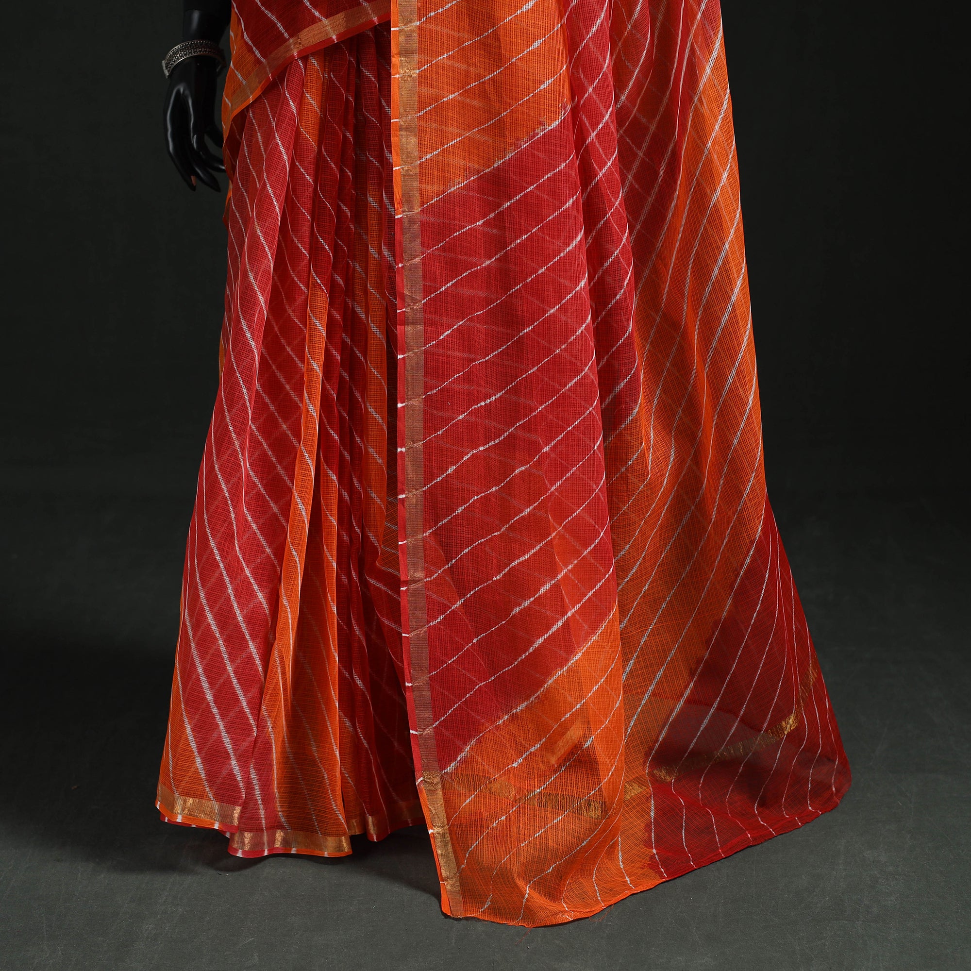 Leheriya kota doria cotton saree, crafted using Rajasthan tie-dye technique by master artisan Adil Hussain. Leheriya is a centuries-old dyeing tradition, believed to be over 300 years old, and is deeply rooted in Rajasthan’s cultural heritage. The lightweight and breathable kota doria saree, originating from the Kota district, features finely interwoven threads that create its signature check pattern. Its sheer texture offers an airy, graceful drape, making it ideal for occasions, cultural gatherings, and elegant everyday wear.