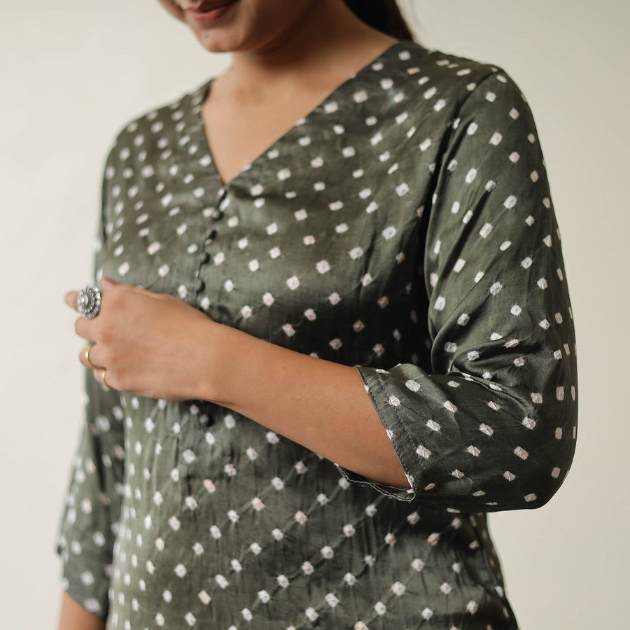 This grey tie & dye modal silk straight bandhani kurta is a perfect blend of style and comfort. This kurta is crafted from modal silk, ensuring a comfortable feel against your skin. The kurta also features a convenient one-side pocket, perfect for carrying small essentials. This kurta is perfect for your daily outing and for a special occasion.