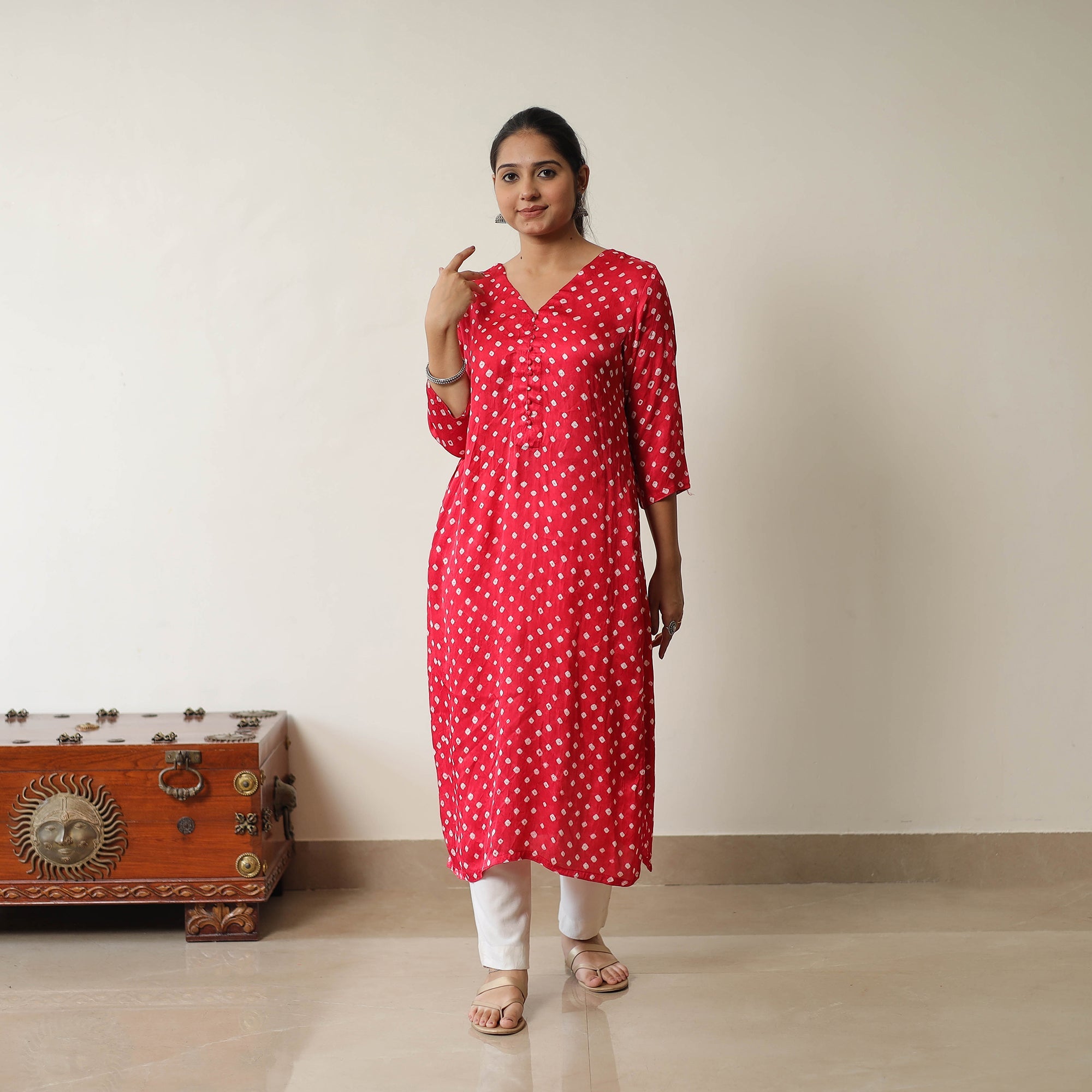 This pink tie & dye modal silk straight bandhani kurta is a perfect blend of style and comfort. This kurta is crafted from modal silk, ensuring a comfortable feel against your skin. The kurta also features a convenient one-side pocket, perfect for carrying small essentials. This kurta is perfect for your daily outing and for a special occasion.