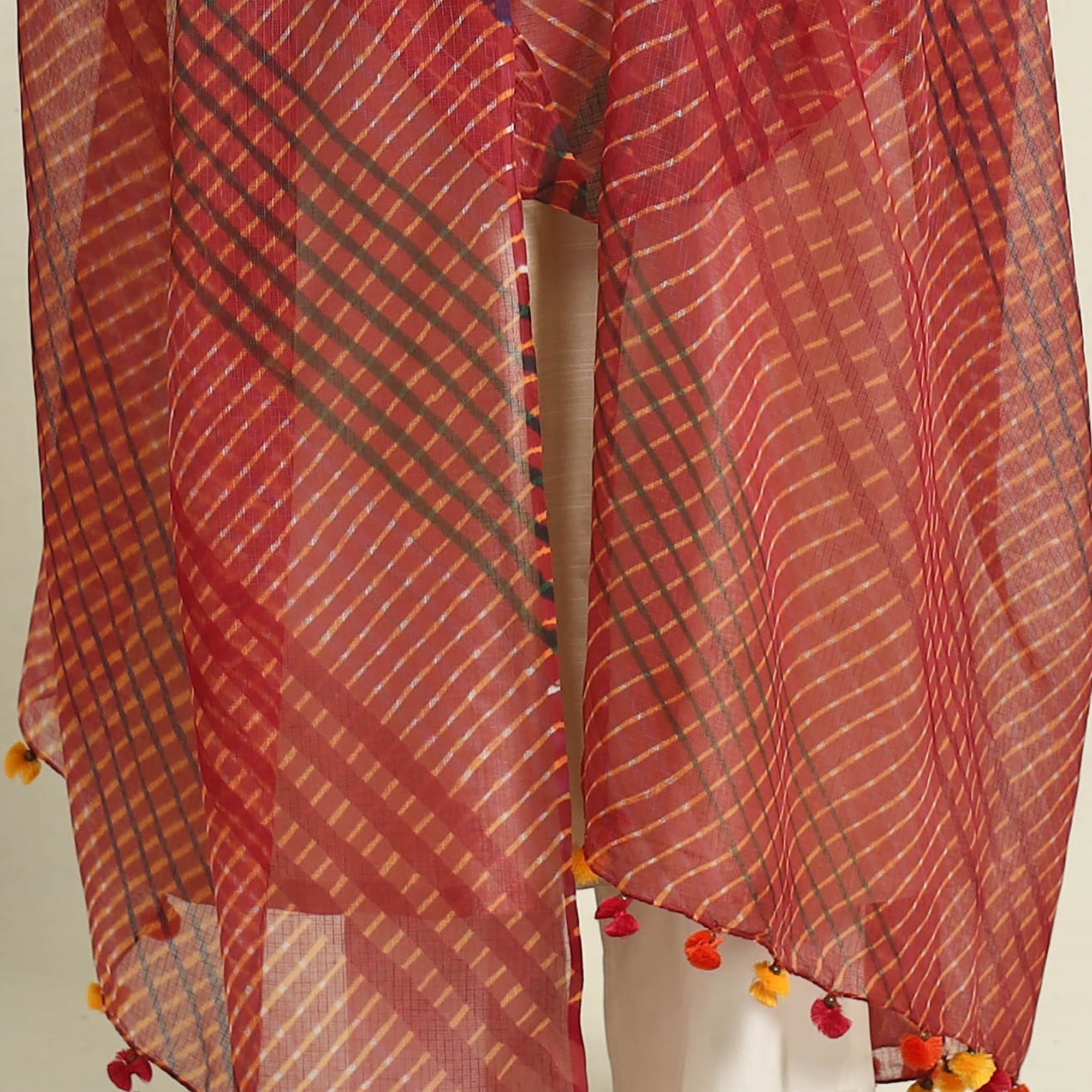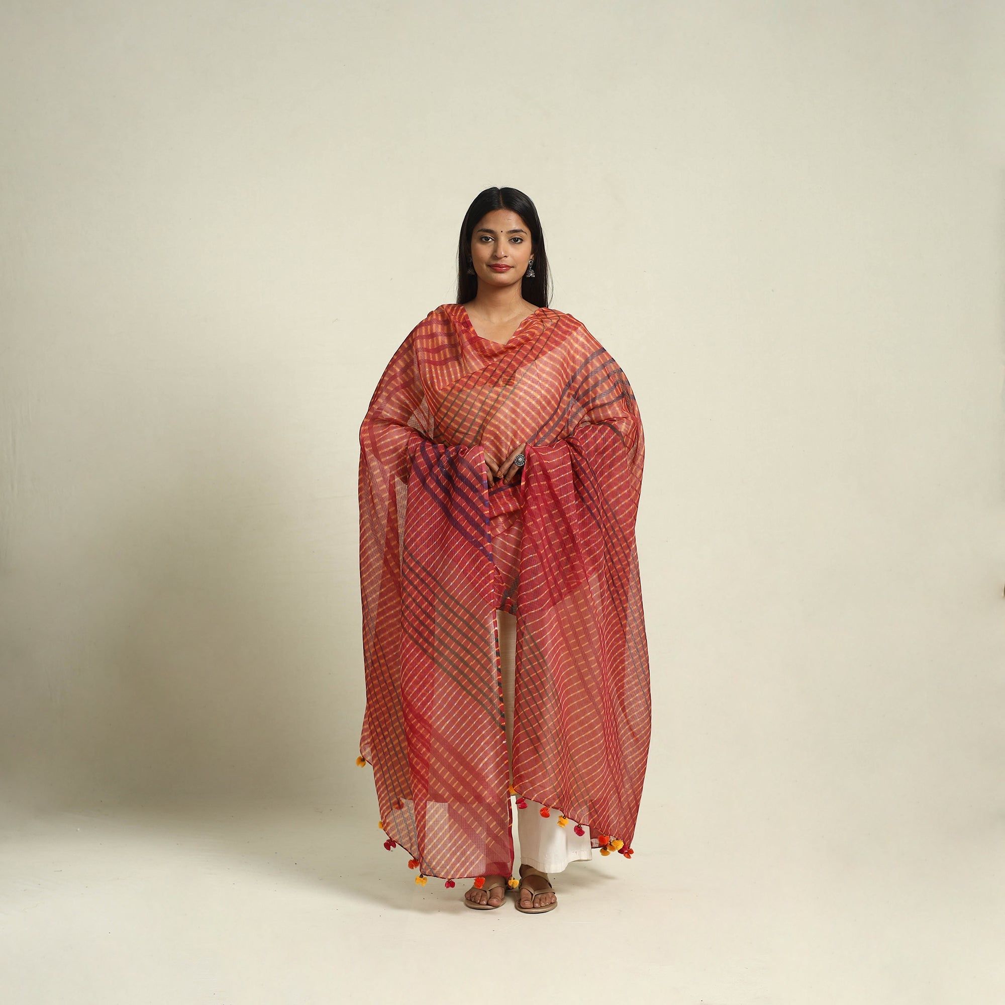 Step into tradition with this mothra red kota doria cotton leheriya dupatta, adorned with tassels. The wavy patterns are created using the traditional leheriya tie & dye technique by the master artisan family of Badshah Miyan from Rajasthan. Kota Doria, a blend of strong cotton and lustrous silk, offers a lightweight yet elegant drape. Perfect for both formal and casual occasions, this dupatta adds a graceful touch of Indian heritage to your look.