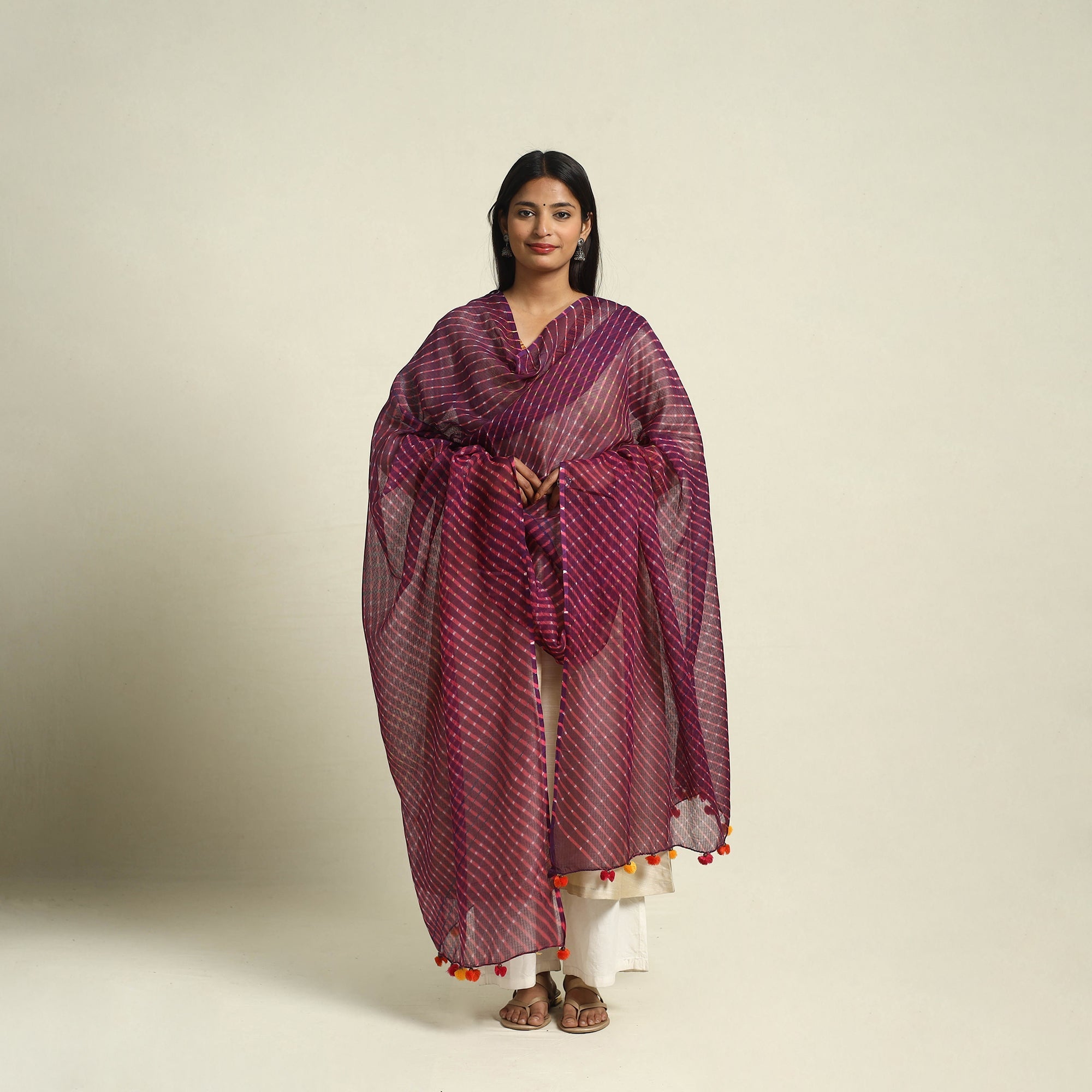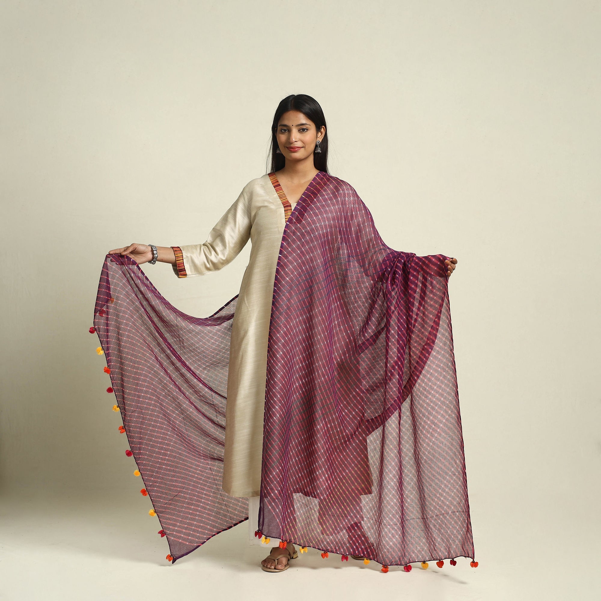 Step into tradition with this purple mothra kota doria cotton leheriya dupatta, adorned with tassels. The wavy patterns are created using the traditional leheriya tie & dye technique by the master artisan family of Badshah Miyan from Rajasthan. Kota Doria, a blend of strong cotton and lustrous silk, offers a lightweight yet elegant drape. Perfect for both formal and casual occasions, this dupatta adds a graceful touch of Indian heritage to your look.