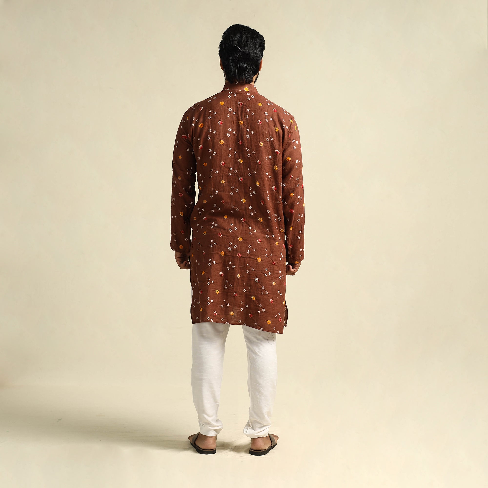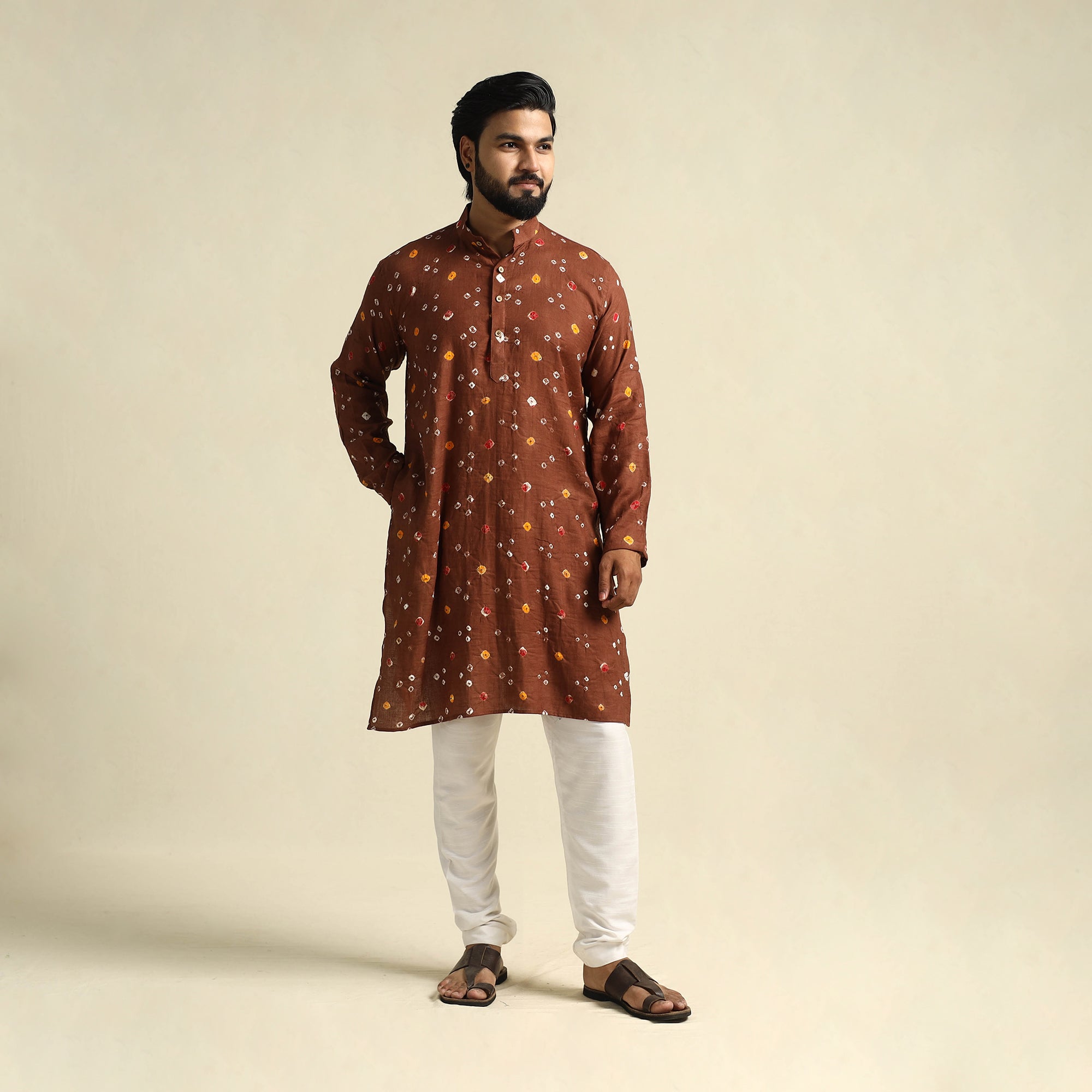 Stay comfortable and stylish with this brown mul cotton long bandhani kurta for men, crafted from soft, breathable fabric using the traditional tie-resist dyeing technique by skilled artisans of Kutch. Designed with full sleeves, a stand collar, two side pockets for added ease, and a button placket, the light weave and intricate patterns make it a perfect choice for daily outings, festive gatherings, or relaxed weekends.