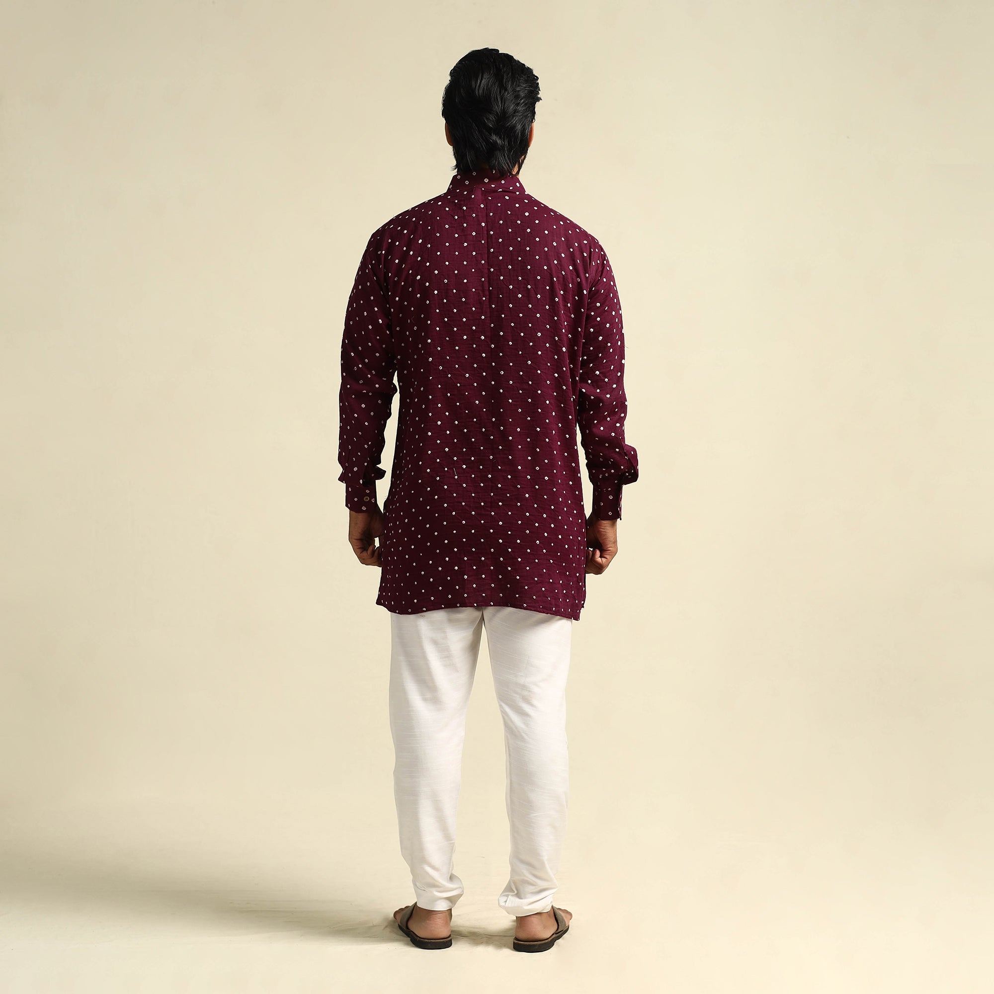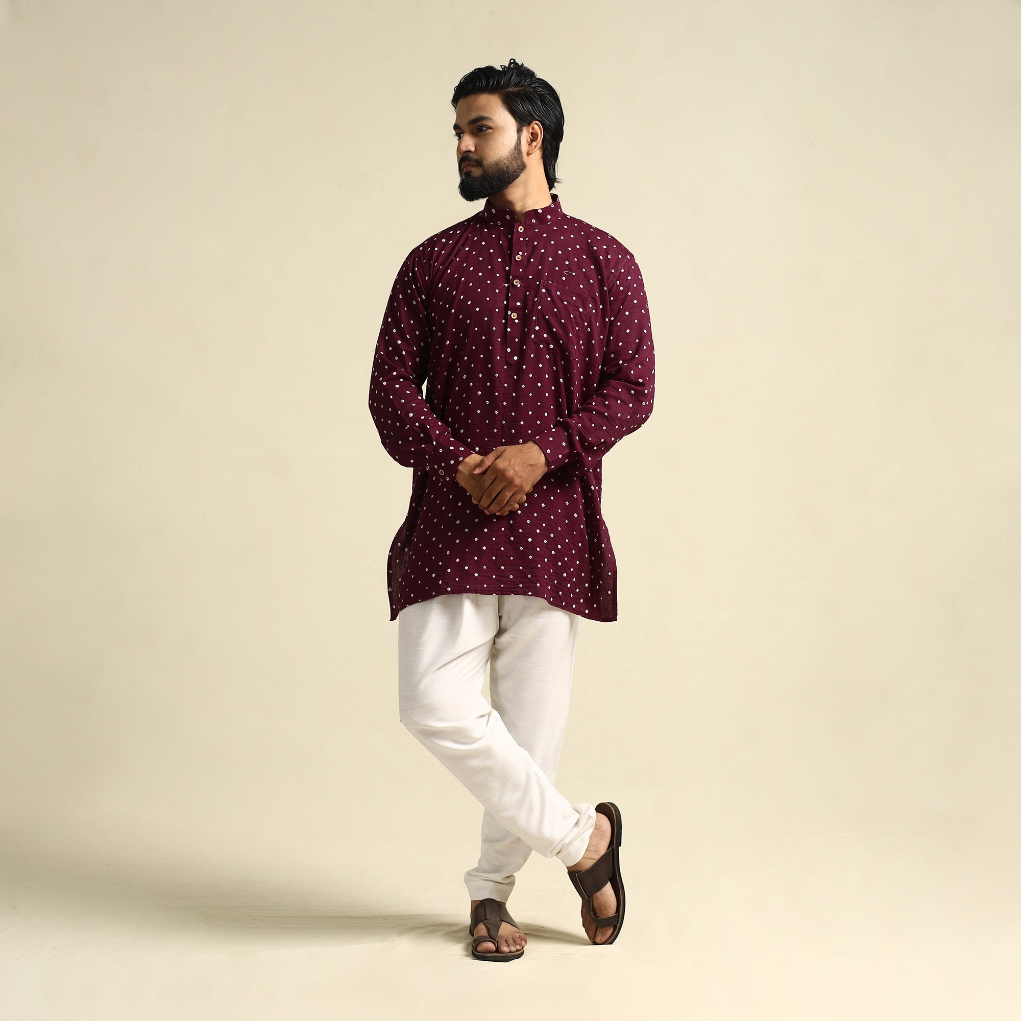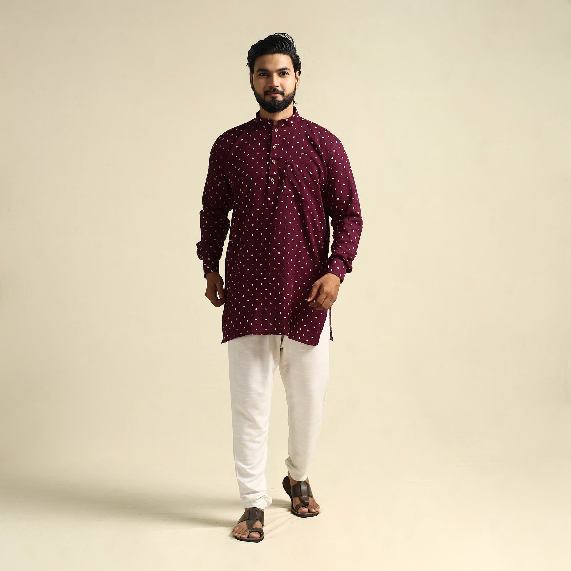 Stay comfortable and stylish with this purple mul cotton short bandhani kurta for men, crafted from soft, breathable fabric using the traditional tie-resist dyeing technique by skilled artisans of Kutch. Designed with full sleeves, a stand collar, a front pocket for added convenience, and a button placket, the light weave and intricate patterns make it a perfect choice for daily outings, festive gatherings, or relaxed weekends.