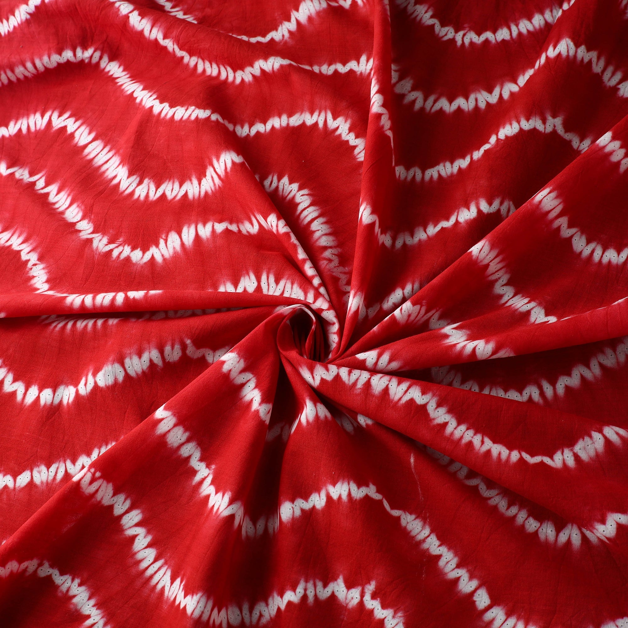 Fine quality red tie & dye pure cotton shibori fabric. This fabric is hand dyed using shibori tie and dye technique in which the fabric is tied using clamp or stitches in the required design and the pattern is dyed. This cotton fabric is soft, eco-friendly.