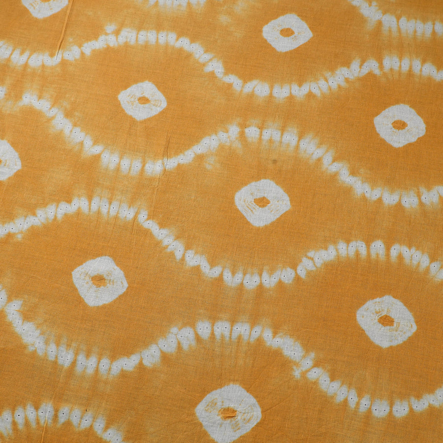 Fine quality yellow tie & dye pure cotton shibori fabric. This fabric is hand dyed using shibori tie and dye technique in which the fabric is tied using clamp or stitches in the required design and the pattern is dyed. This cotton fabric is soft, eco-friendly.