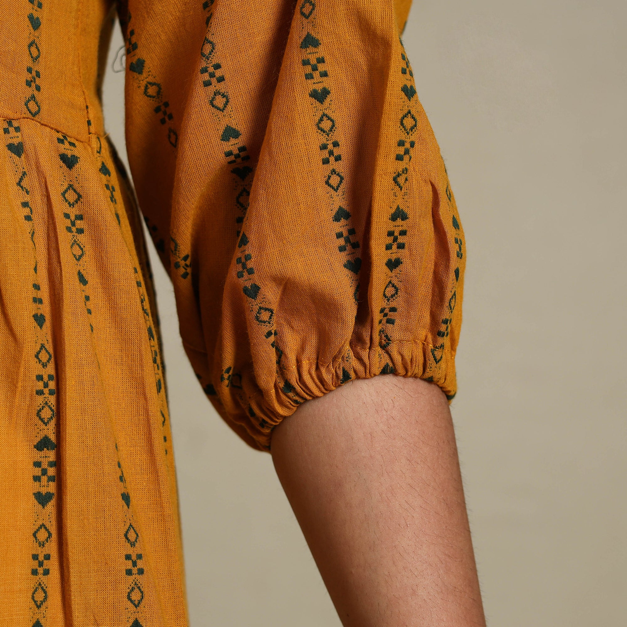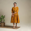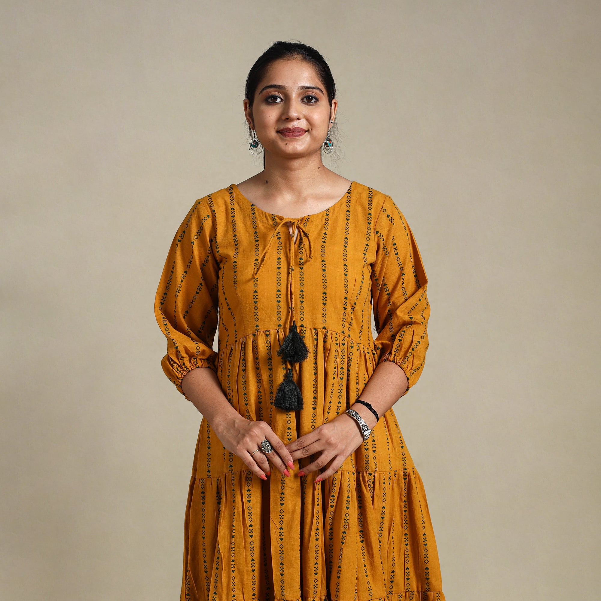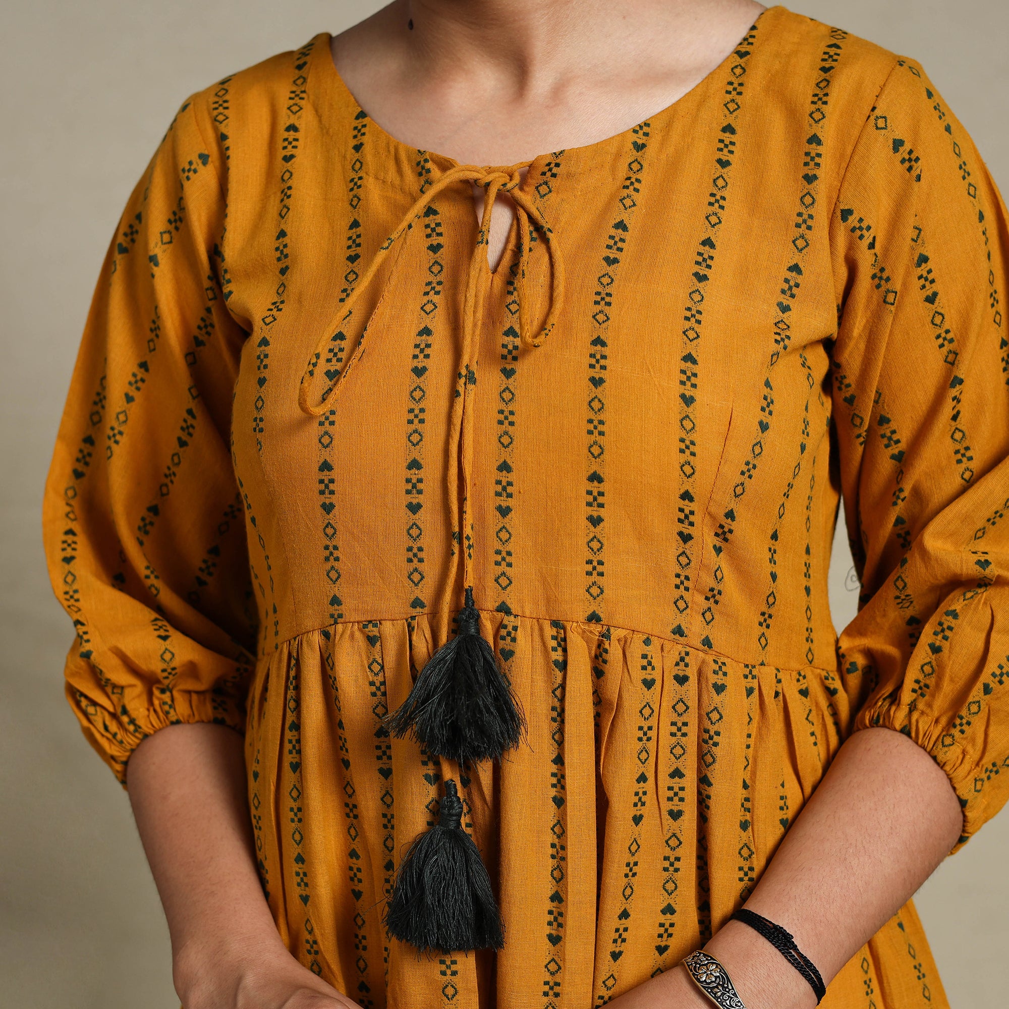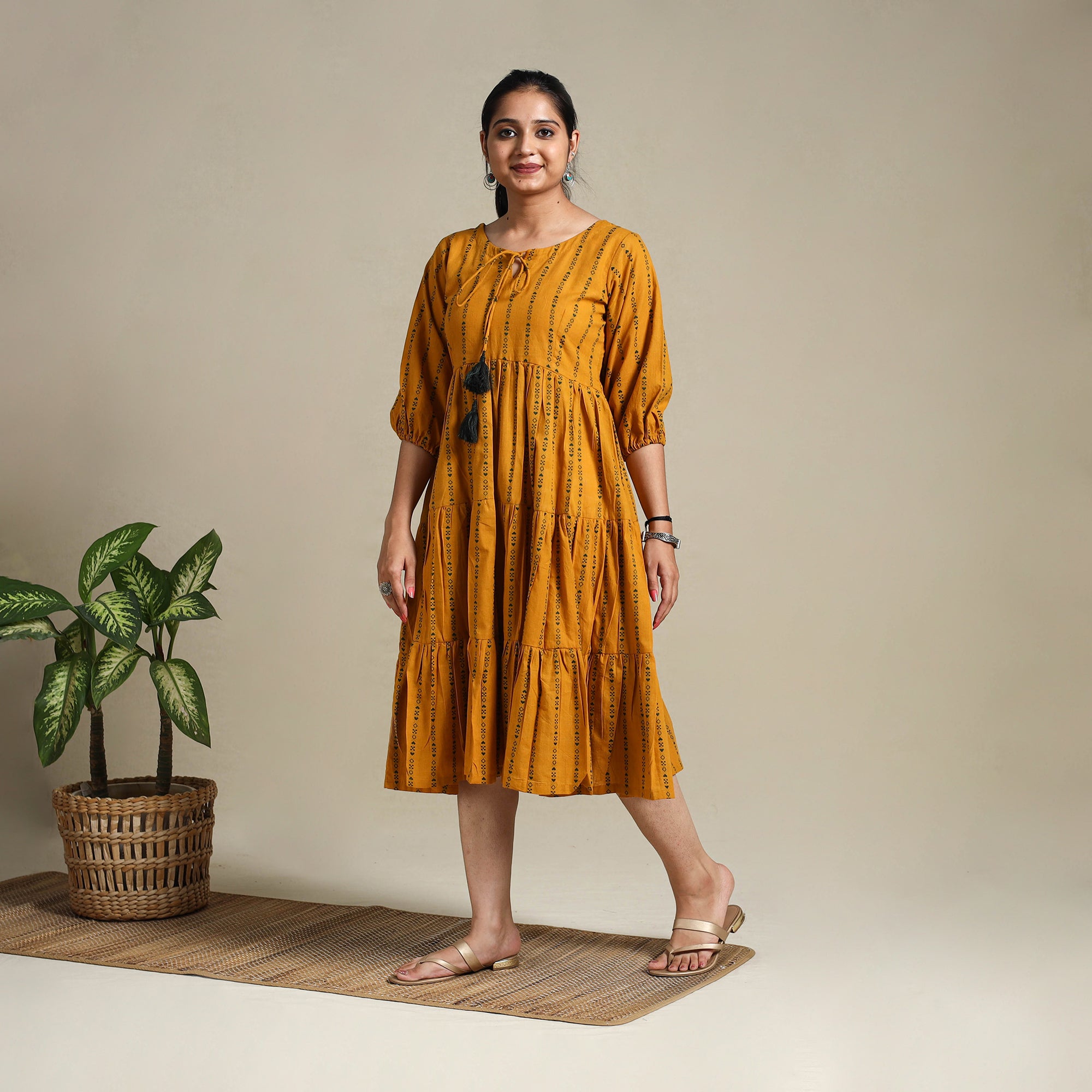 This yellow cotton jacquard dress blends traditional weaving with modern elegance. Crafted by skilled artisans, it showcases the beauty of jacquard, a weaving technique celebrated for its intricate patterns. The breathable cotton fabric ensures all-day comfort, while the graceful tiered fit-and-flare design adds charm and ease to your look. Perfect for casual outings, office wear, or relaxed gatherings.