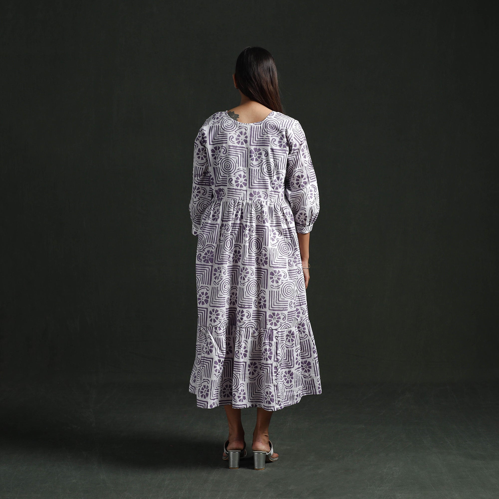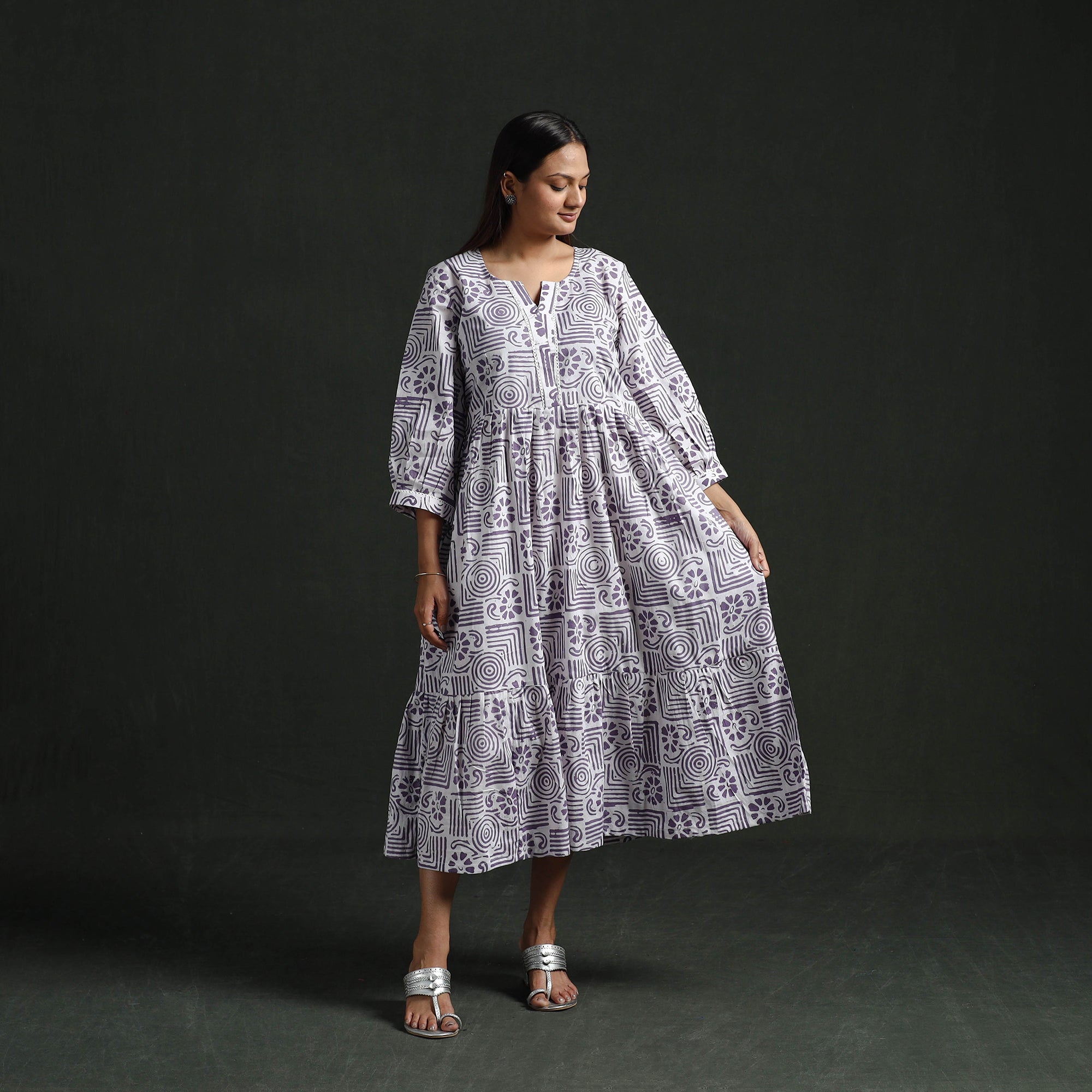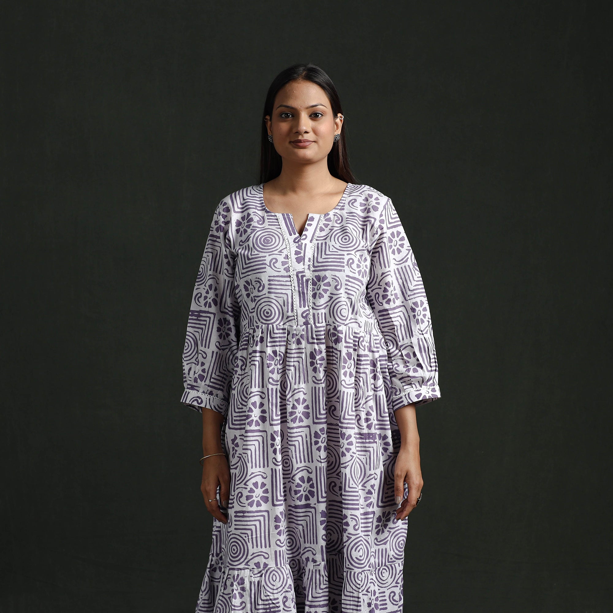 Tiered flared lace work dress is designed in a traditional batik block print created using the wax-resist dyeing technique. The batik design is formed through a process that has been practiced in India for centuries. In this process, hot wax is applied in patterns on the fabric before dyeing to create defined motifs. The dress features delicate lace work on the neckline and sleeve ends, adding a refined detail to the overall appearance. Made from cotton, it remains comfortable for extended hours. The tiered flared silhouette provides graceful movement and ease, making it a practical and stylish option for daily wear, casual outings, or relaxed gatherings.