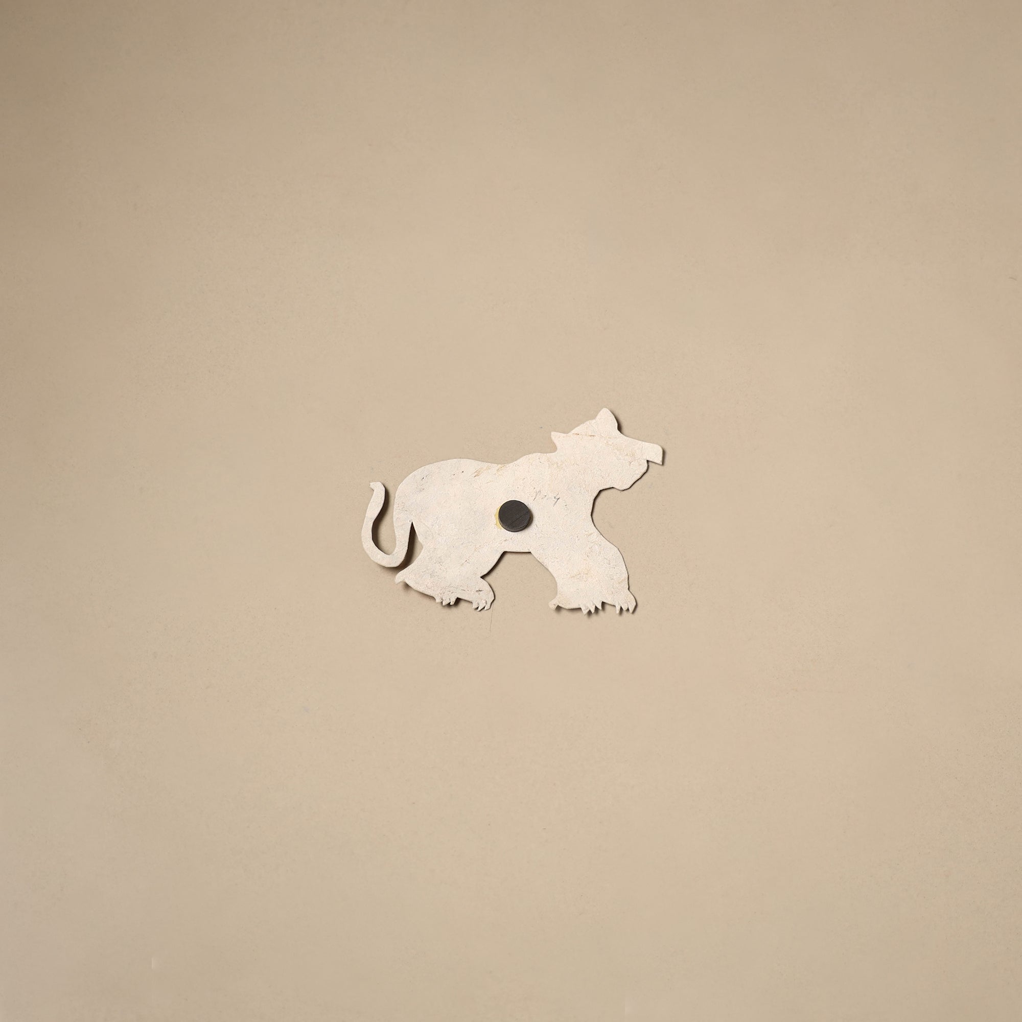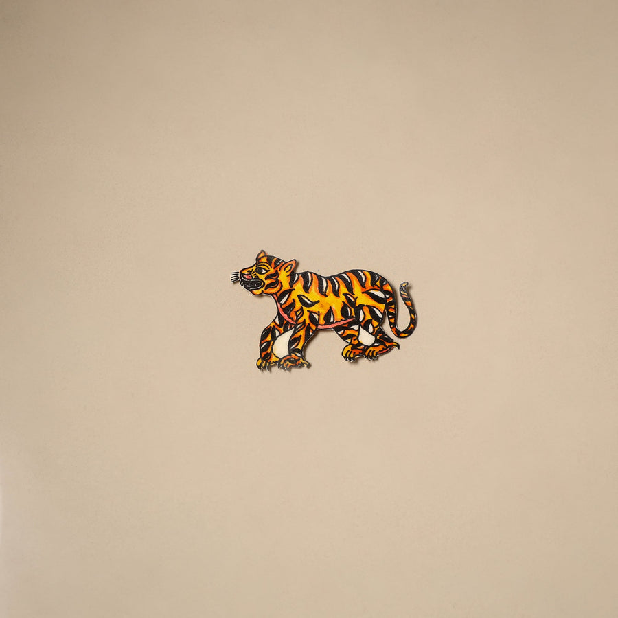 Orange tholu bommalata leather puppet fridge magnet is made by master artist Sindhe Siva from Nimmalakunta, a village in Andhra Pradesh known for its traditional shadow puppetry style. This piece is handpainted on leather using techniques that have been followed in the region for generations. This magnet adds a touch of art and character to your home decor.