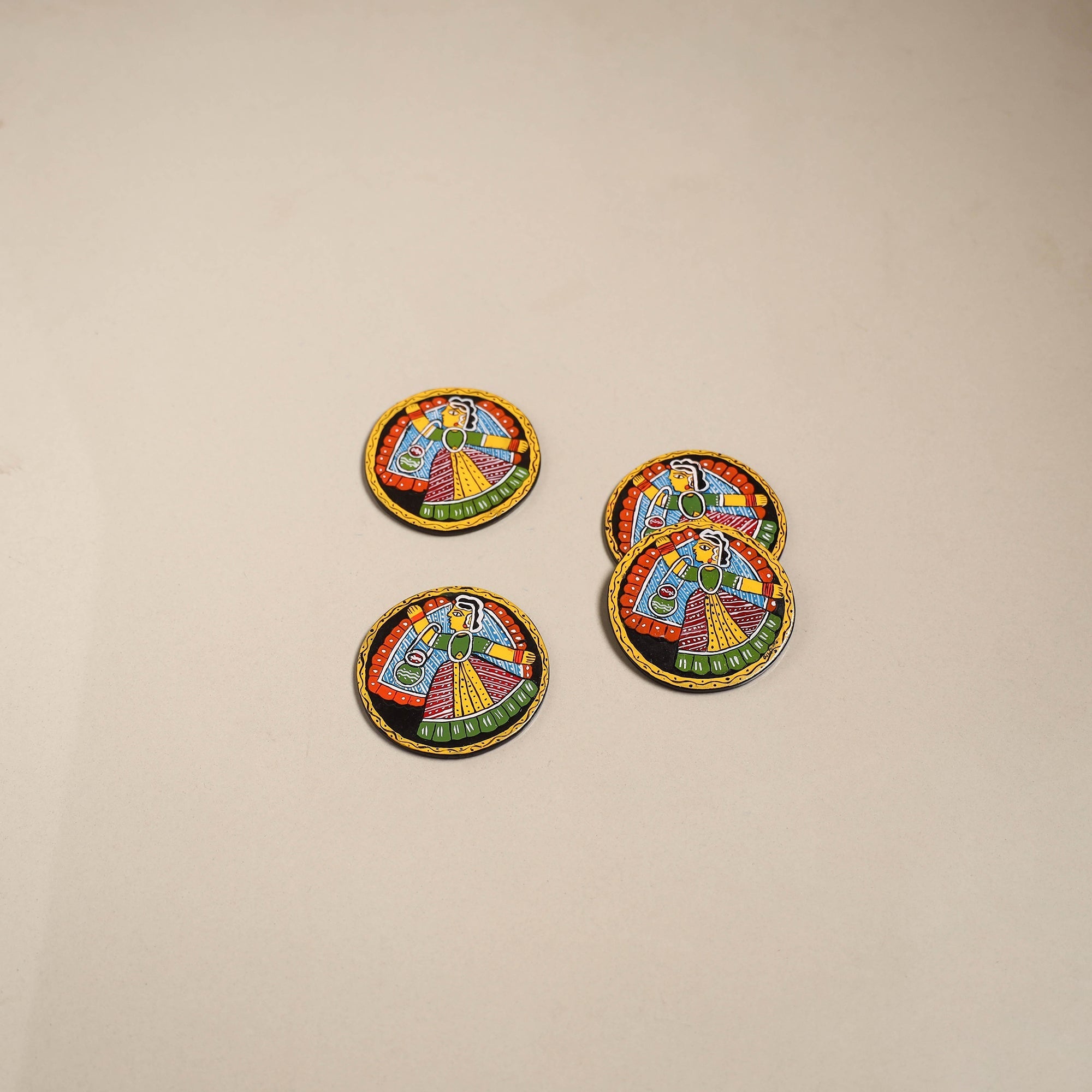 | Material | Black tikuli art coaster set is crafted from sturdy MDF wood. Tikuli art, which originated over 800 years ago in Patna, Bihar is named after the “tikuli” or bindi worn by women. Known for its bold colors and black backgrounds, the motifs depict mythology, daily life and cultural traditions making this set both functional and culturally rich. |