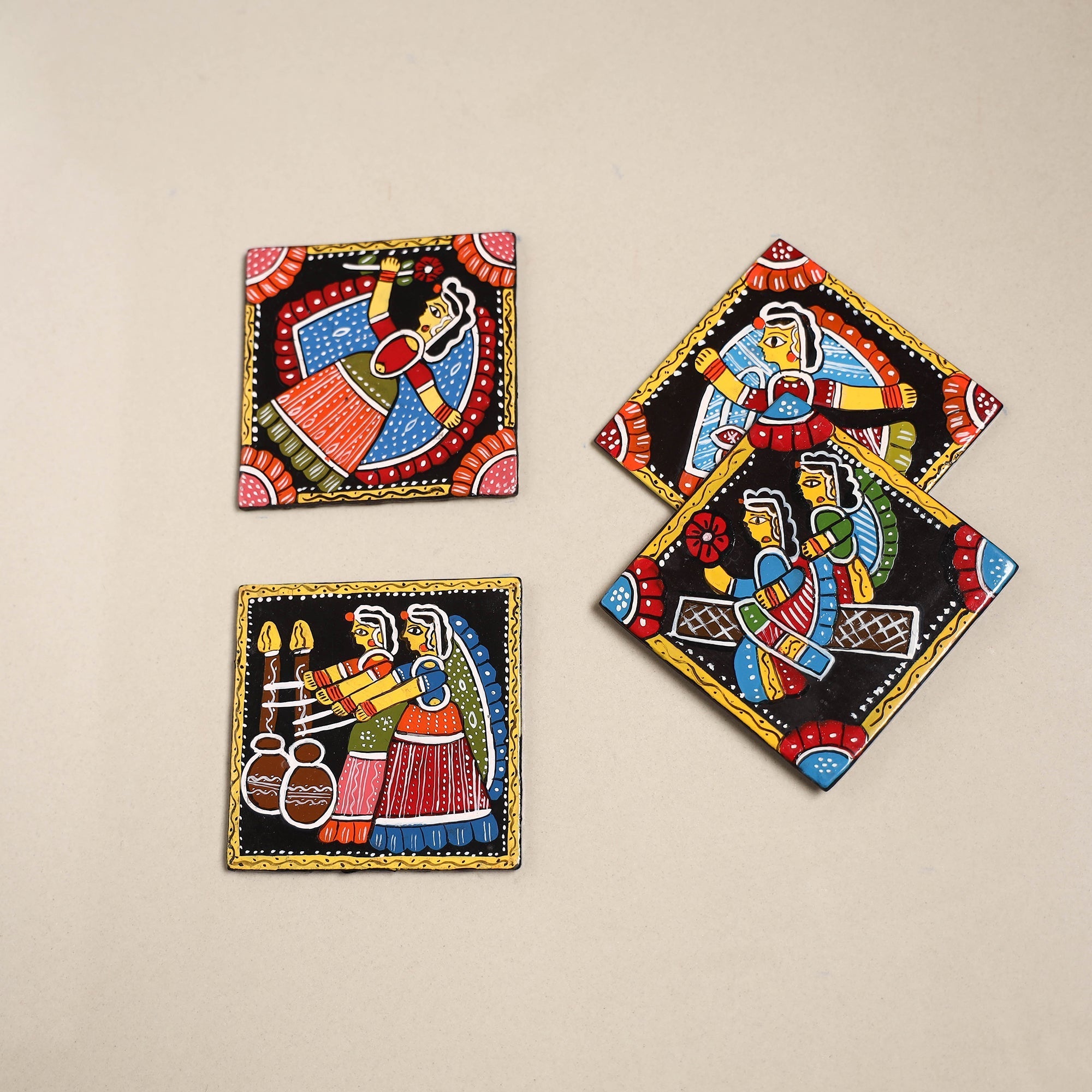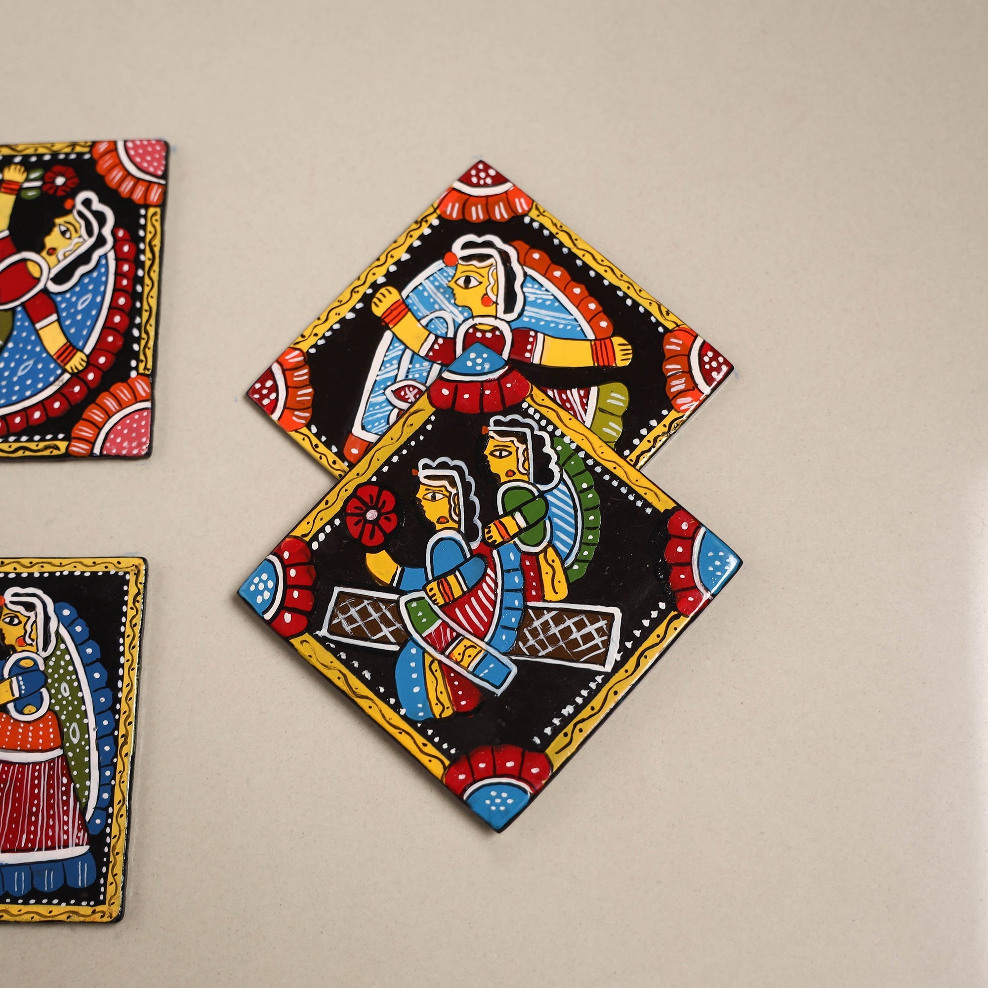 Black tikuli art coaster set is crafted from sturdy MDF wood. Tikuli art, which originated over 800 years ago in Patna, Bihar is named after the “tikuli” or bindi worn by women. Known for its bold colors and black backgrounds, the motifs depict mythology, daily life and cultural traditions making this set both functional and culturally rich.