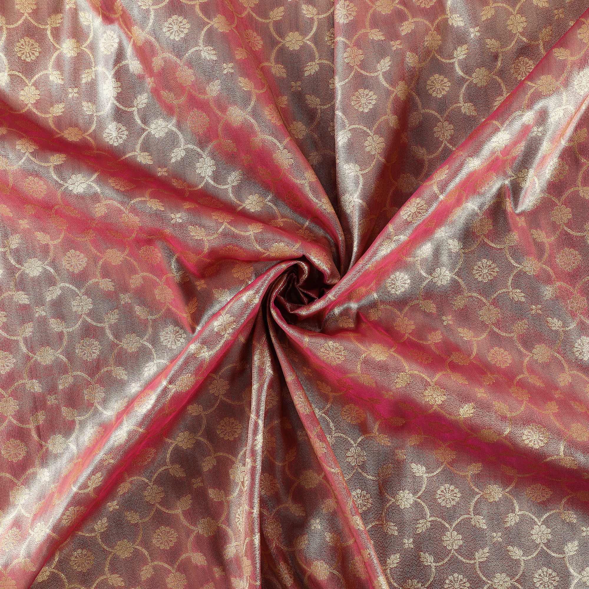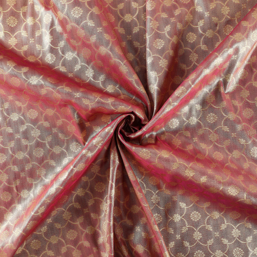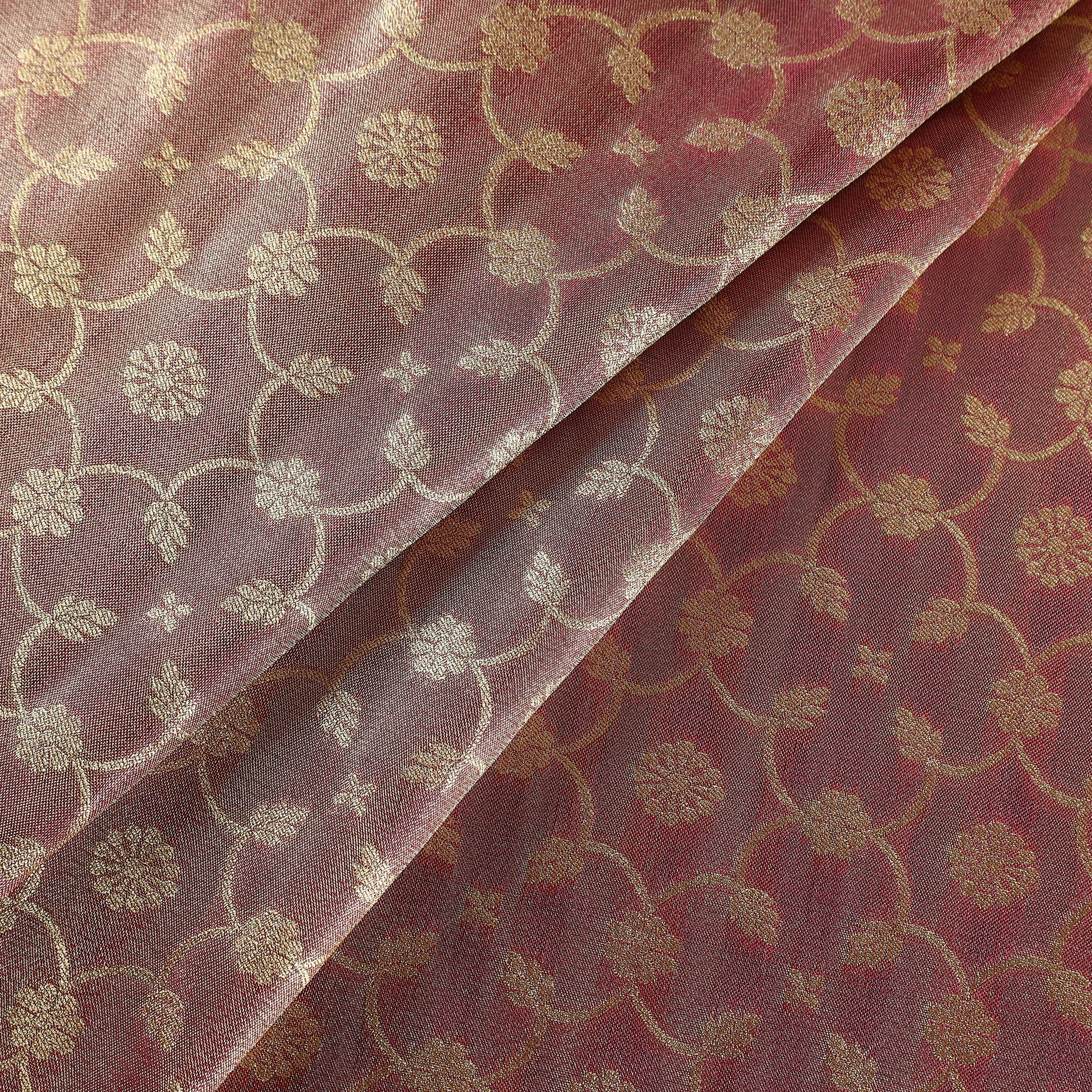 Elevate your wardrobe with this pink tissue zari jaal cutwork banarasi silk fabric. This elegant banarasi fabric is made from a blend of poly and viscose. made using traditional techniques passed down through generations of skilled artisans, this fabric embodies the elegance and charm of Banaras. Making it perfect for crafting ethnic wear like sarees, lehengas, or kurtas.