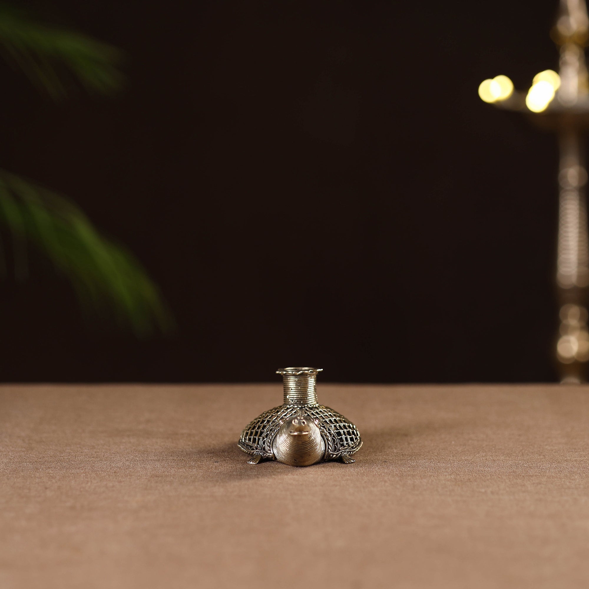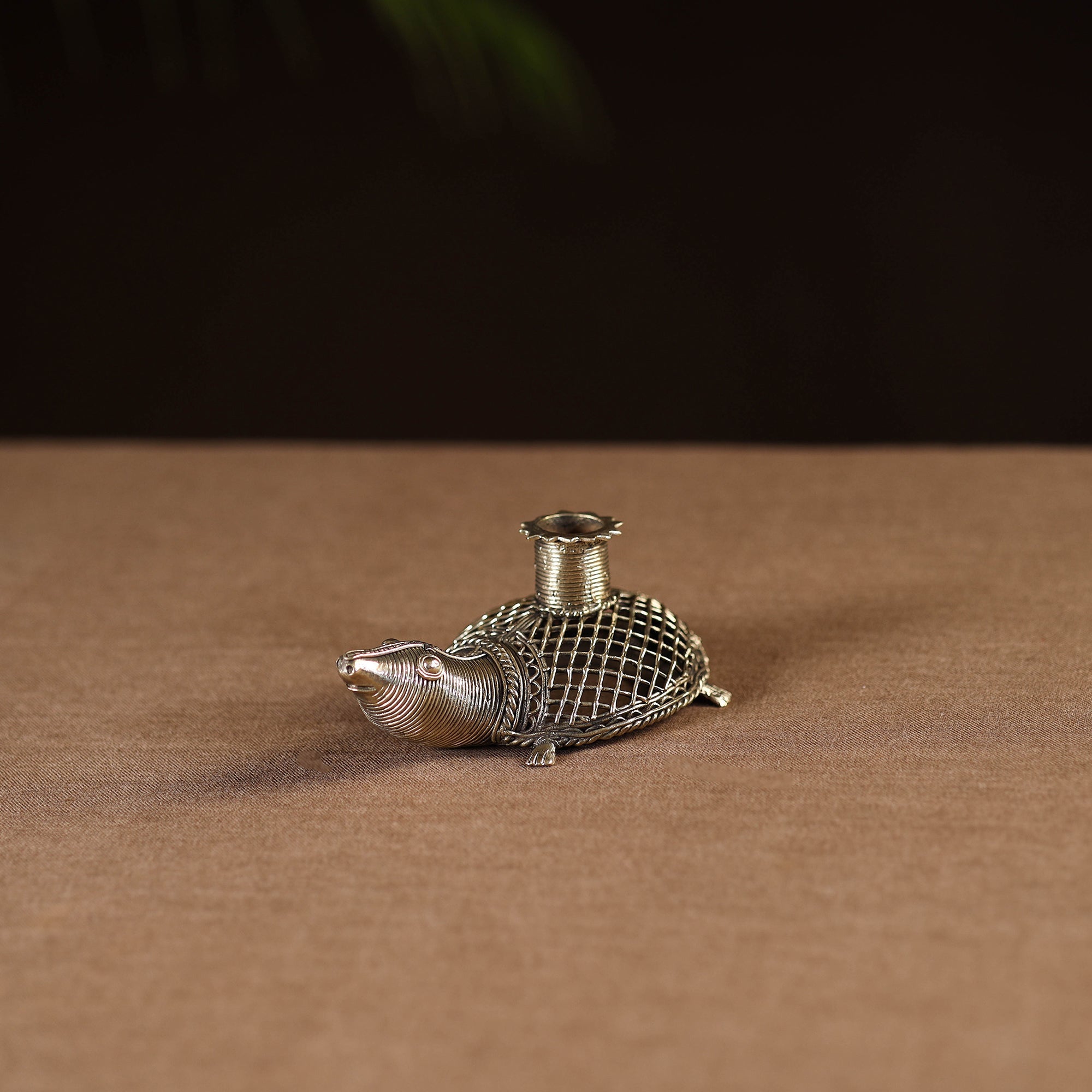 Handcrafted yellow brass metal alloy dokra candle stand made by tribal artisans. The Dokra system of metal casting is believed to be one of the oldest known methods and is technically referred to as the cire perdue or lost-wax process. In this technique, wax is replaced by molten metal through a traditional hollow-casting method. This highly intricate and time-intensive process is still practiced in various tribal regions of India, especially in Chhattisgarh and Odisha, where the legacy of Dokra artistry continues to thrive.