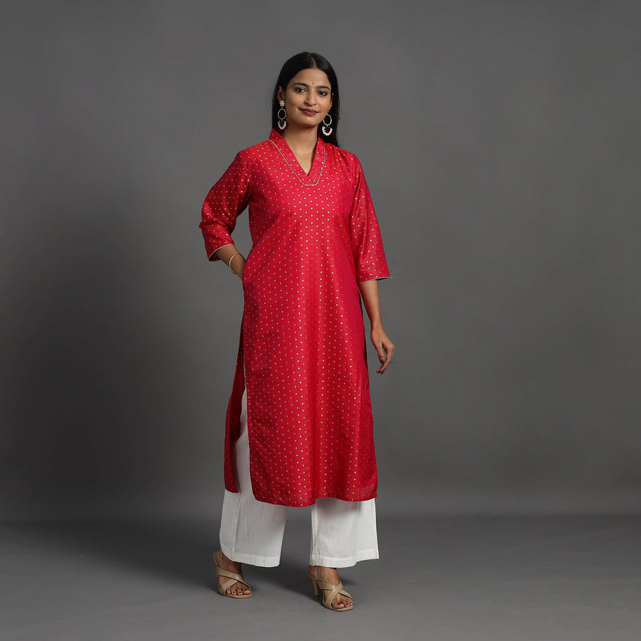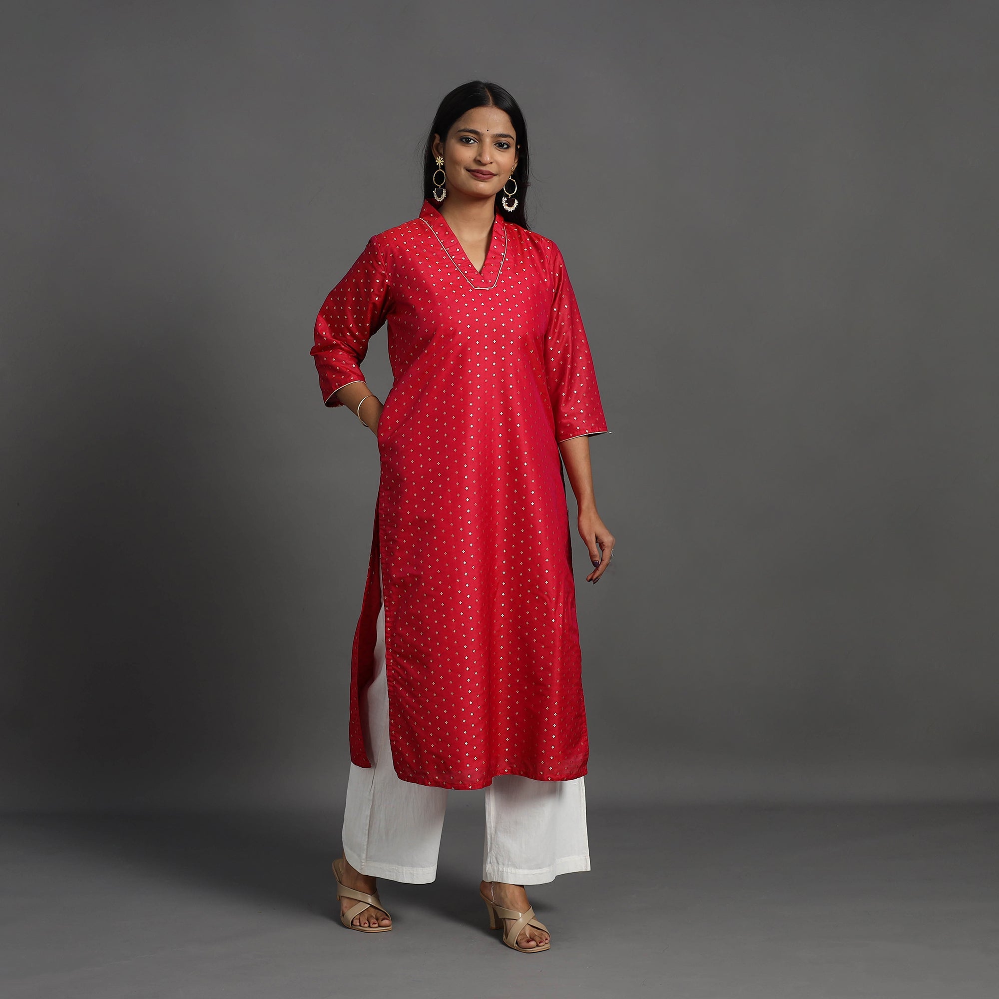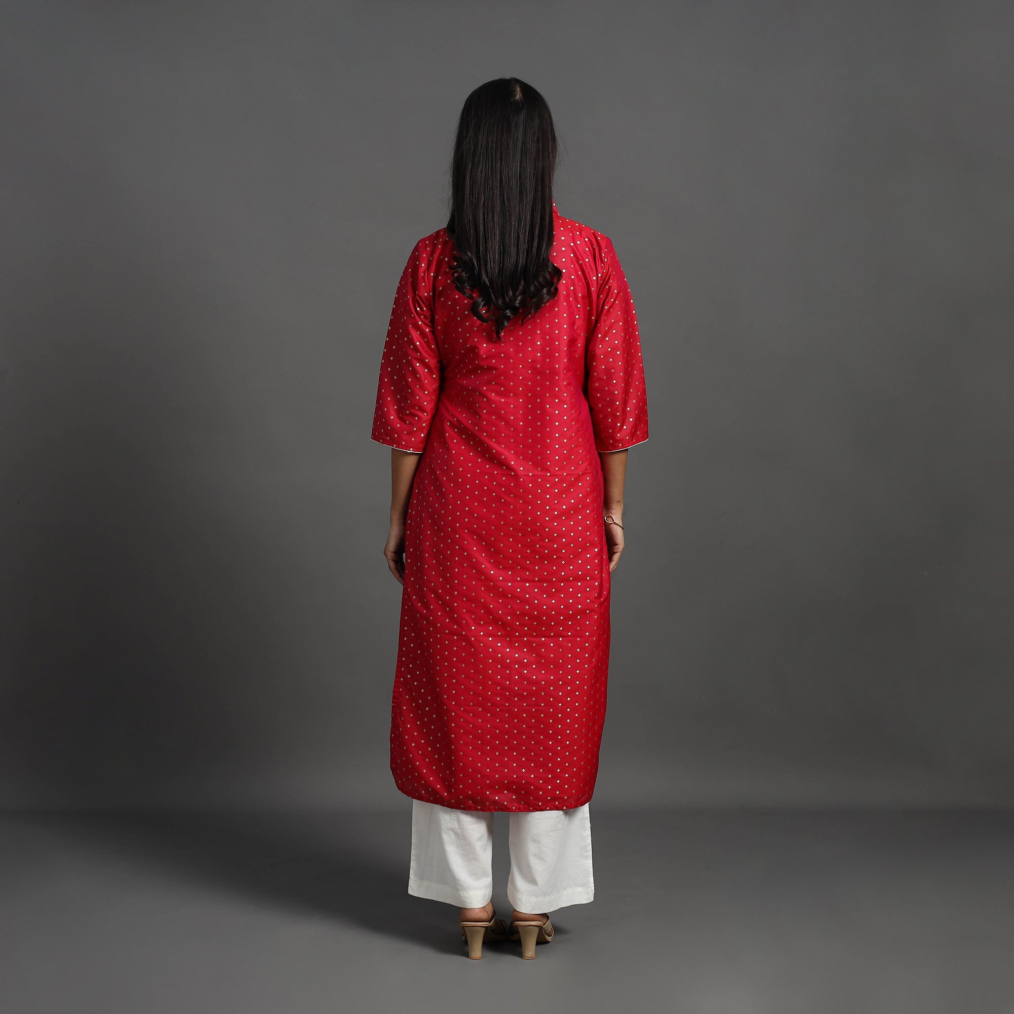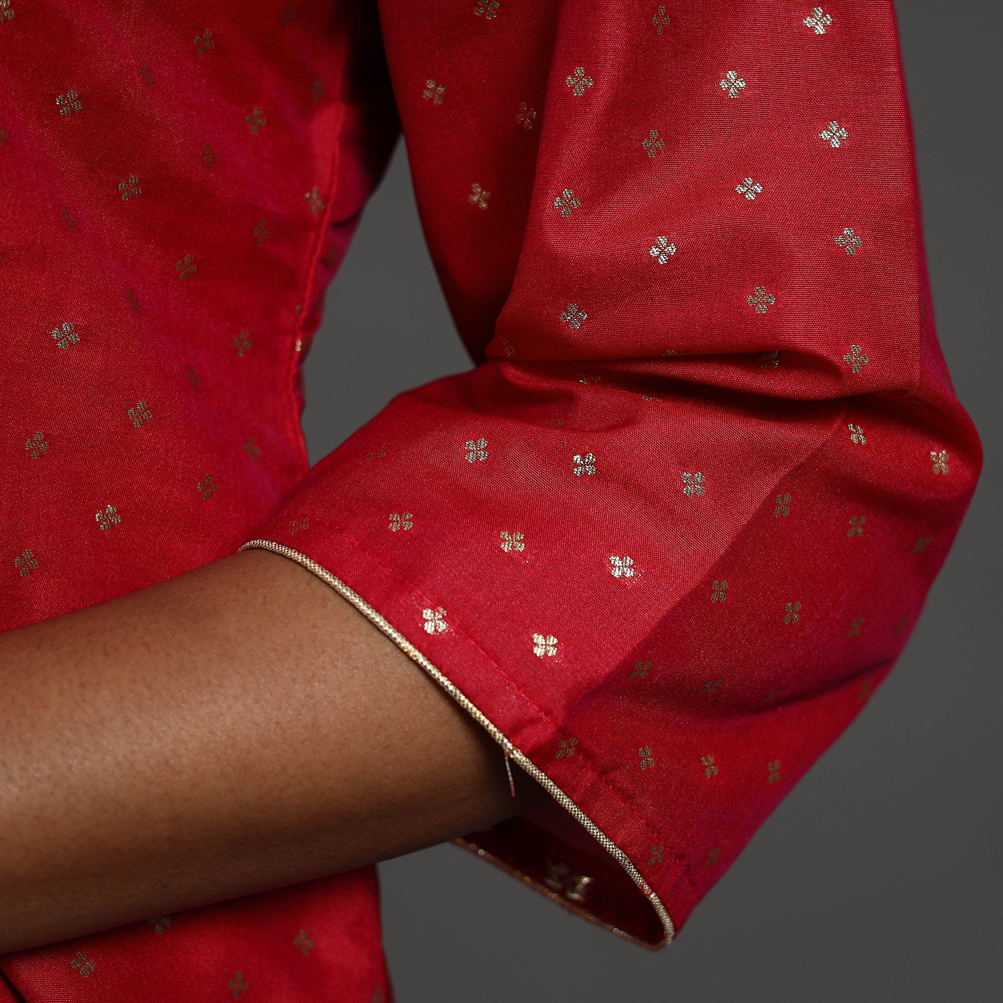 Step into timeless elegance with this red traditional cutwork zari buti banarasi silk kurta. This banarasi kurta is crafted from cutwork banarasi silk fabric. It boasts an zari buti design, adding a touch of elegance to your ensemble. The kurta also features a convenient one-side pocket, perfect for carrying small essentials. It's an ideal choice for both casual and festive occasions.