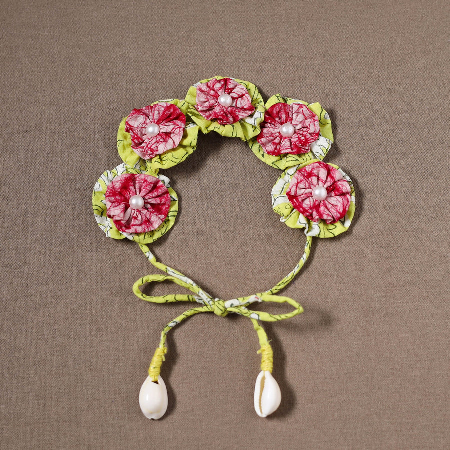 Add charm to your hairstyle with this traditional handmade fabart gajra, featuring fabric flowers, pearls, and shells for a unique look. Crafted with care by skilled artisans, it offers a lightweight and secure fit. Perfect for weddings festive occasions, or adding a traditional touch to everyday styles.