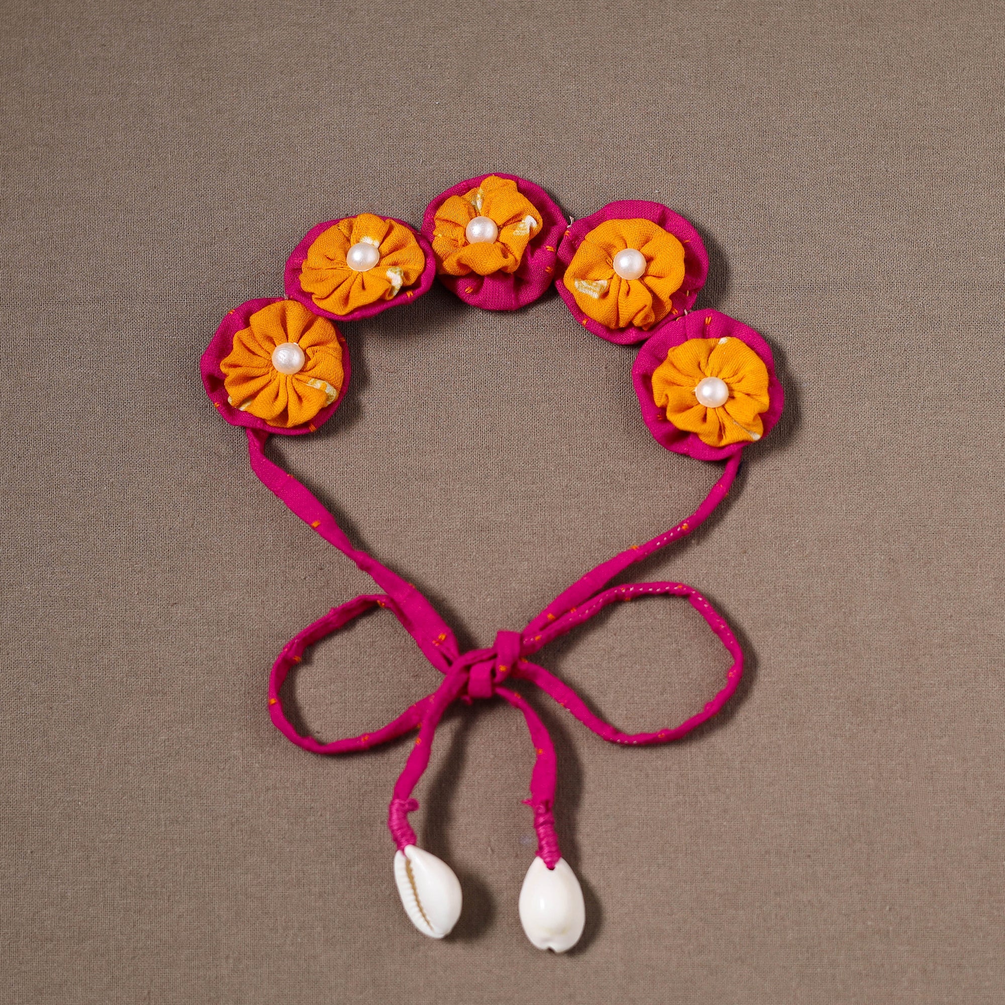 Add charm to your hairstyle with this traditional handmade fabart gajra, featuring fabric flowers, pearls, and shells for a unique look. Crafted with care by skilled artisans, it offers a lightweight and secure fit. Perfect for weddings festive occasions, or adding a traditional touch to everyday styles.