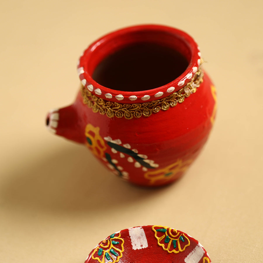 Elevate your worship rituals with this traditional handpainted clay karwa chauth pooja kalash. Crafted by skilled artisans, is a unique work of art. Perfect for your festive rituals. This eco-friendly kalash enhances your celebrations and supports sustainable craftsmanship.