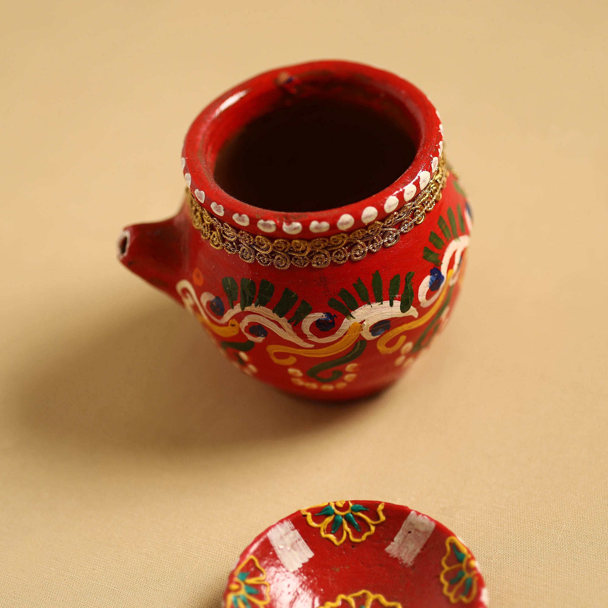 Elevate your worship rituals with this traditional handpainted clay karwa chauth pooja kalash. Crafted by skilled artisans, is a unique work of art. Perfect for your festive rituals. This eco-friendly kalash enhances your celebrations and supports sustainable craftsmanship.