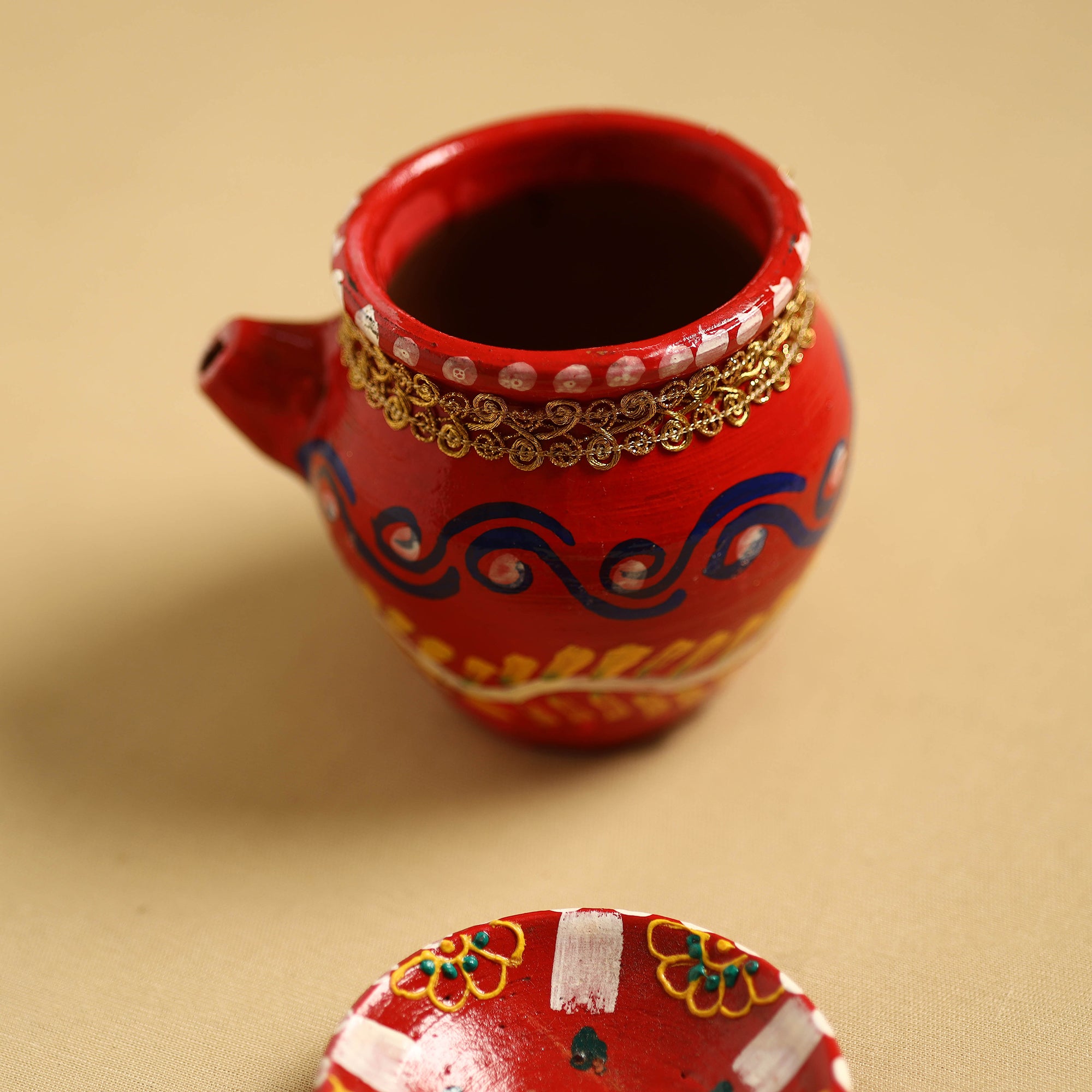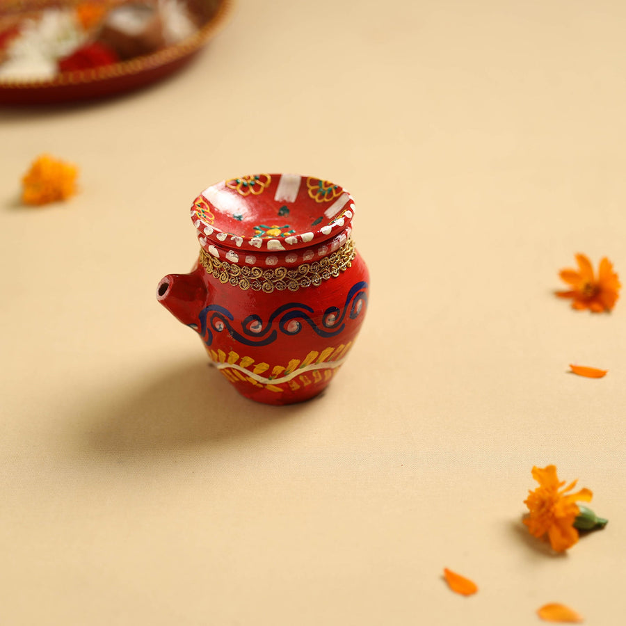 Elevate your worship rituals with this traditional handpainted clay karwa chauth pooja kalash. Crafted by skilled artisans, is a unique work of art. Perfect for your festive rituals. This eco-friendly kalash enhances your celebrations and supports sustainable craftsmanship.