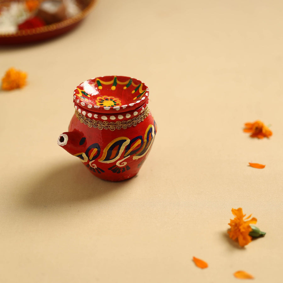Elevate your worship rituals with this traditional handpainted clay karwa chauth pooja kalash. Crafted by skilled artisans, is a unique work of art. Perfect for your festive rituals. This eco-friendly kalash enhances your celebrations and supports sustainable craftsmanship.
