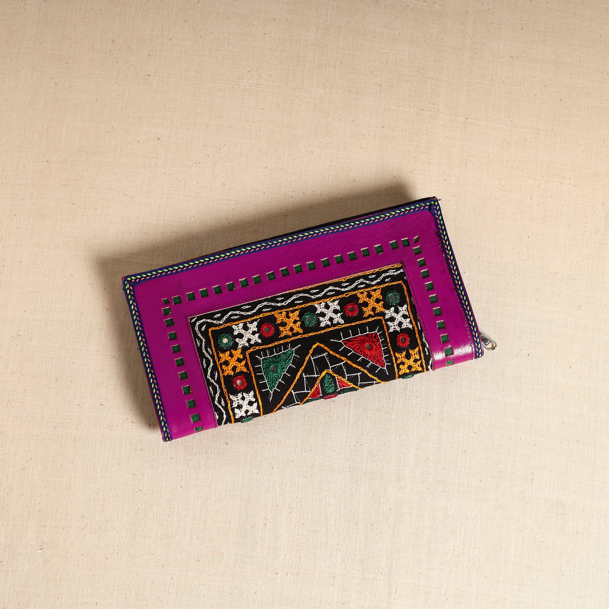| Material | Handcrafted clutch / wallet is made by artisan Mohan Marvada using traditional techniques from the Kutch district of Gujarat. Crafted from goat leather, it features intricate hand-done cutwork along with hand embroidery and mirror work that add depth and detail to its surface. Designed for everyday use, it has three compartments for keeping your cash and bills, along with two separate zipper pockets for coins and important documents. |