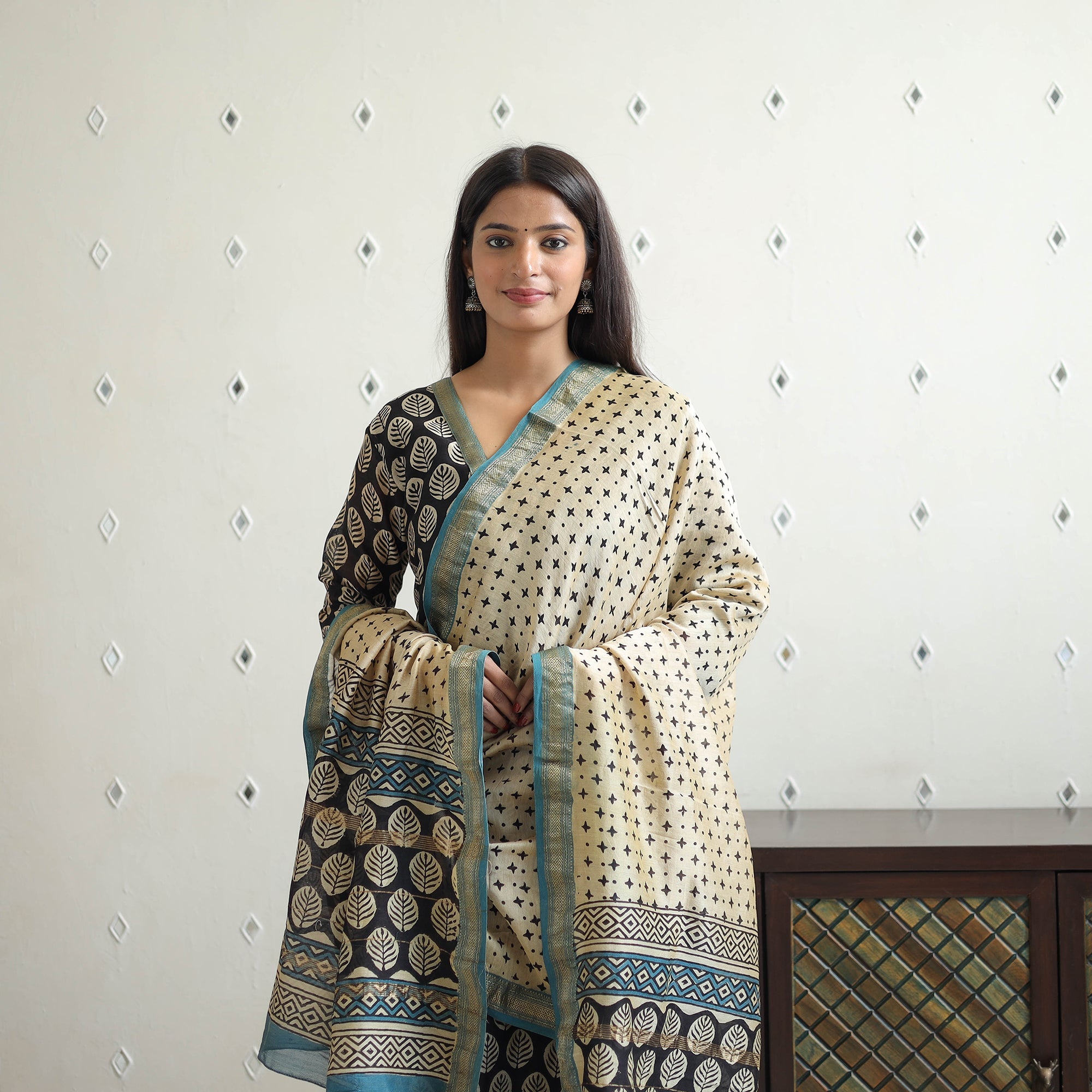 Step up your style with our traditional maheshwari silk bagru print kurta set. This ensemble includes a stylish kurta with one side pocket, comfortable cotton palazzo with an elasticized waist & two side pockets, and a zari-bordered dupatta, all featuring traditional bagru block print motifs. Perfect for festive occasions or casual elegance, this suit reflects timeless artistry.