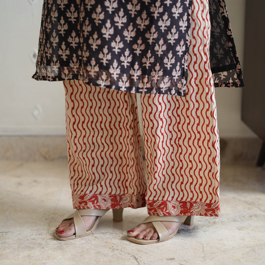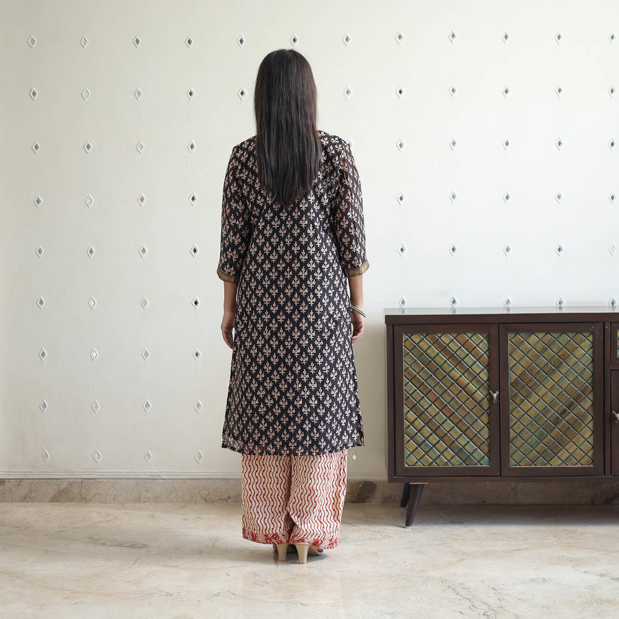 Step up your style with our traditional maheshwari silk bagru print kurta set. This ensemble includes a stylish kurta with one side pocket, comfortable cotton palazzo with an elasticized waist & two side pockets, and a zari-bordered dupatta, all featuring traditional bagru block print motifs. Perfect for festive occasions or casual elegance, this suit reflects timeless artistry.