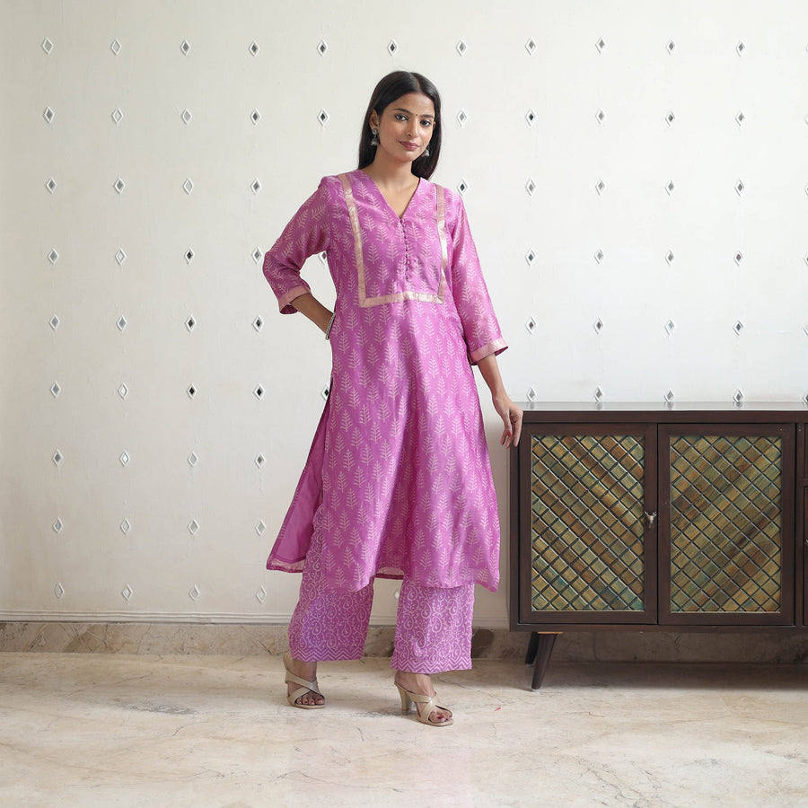 Step up your style with our traditional maheshwari silk bagru print kurta set. This ensemble includes a stylish kurta with one side pocket, comfortable cotton palazzo with an elasticized waist & two side pockets, and a zari-bordered dupatta, all featuring traditional bagru block print motifs. Perfect for festive occasions or casual elegance, this suit reflects timeless artistry.