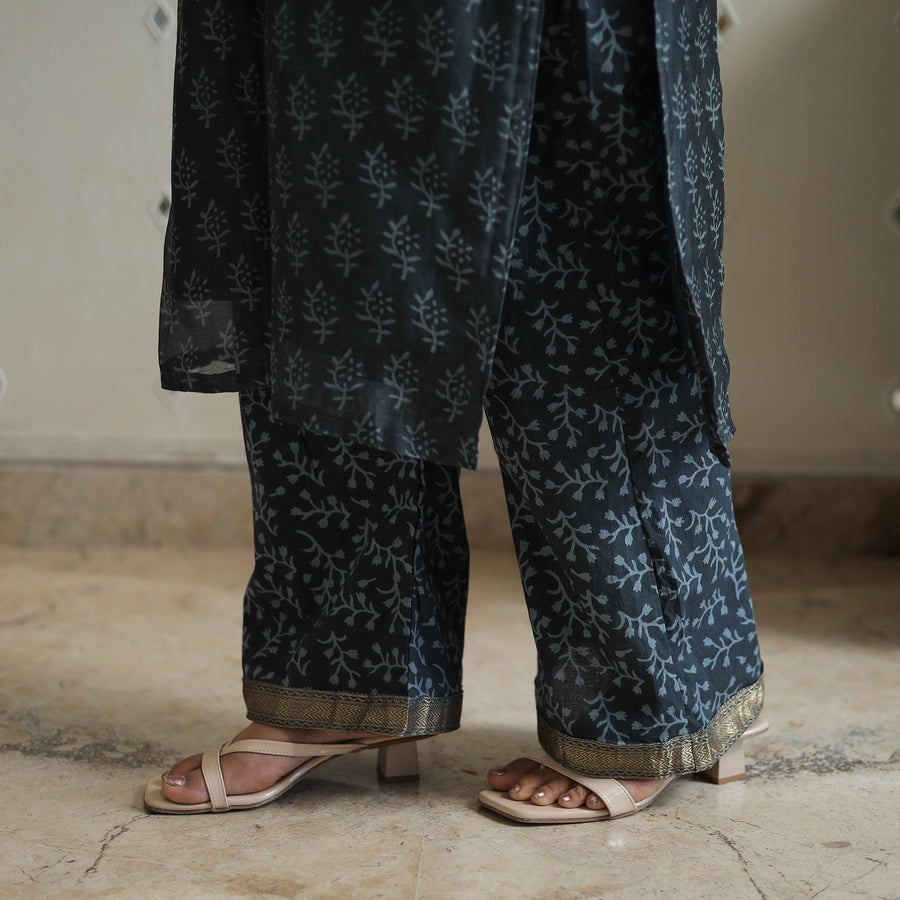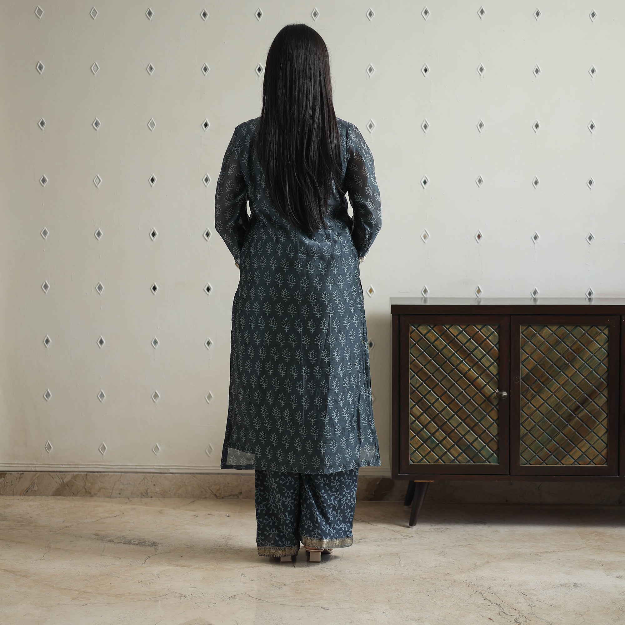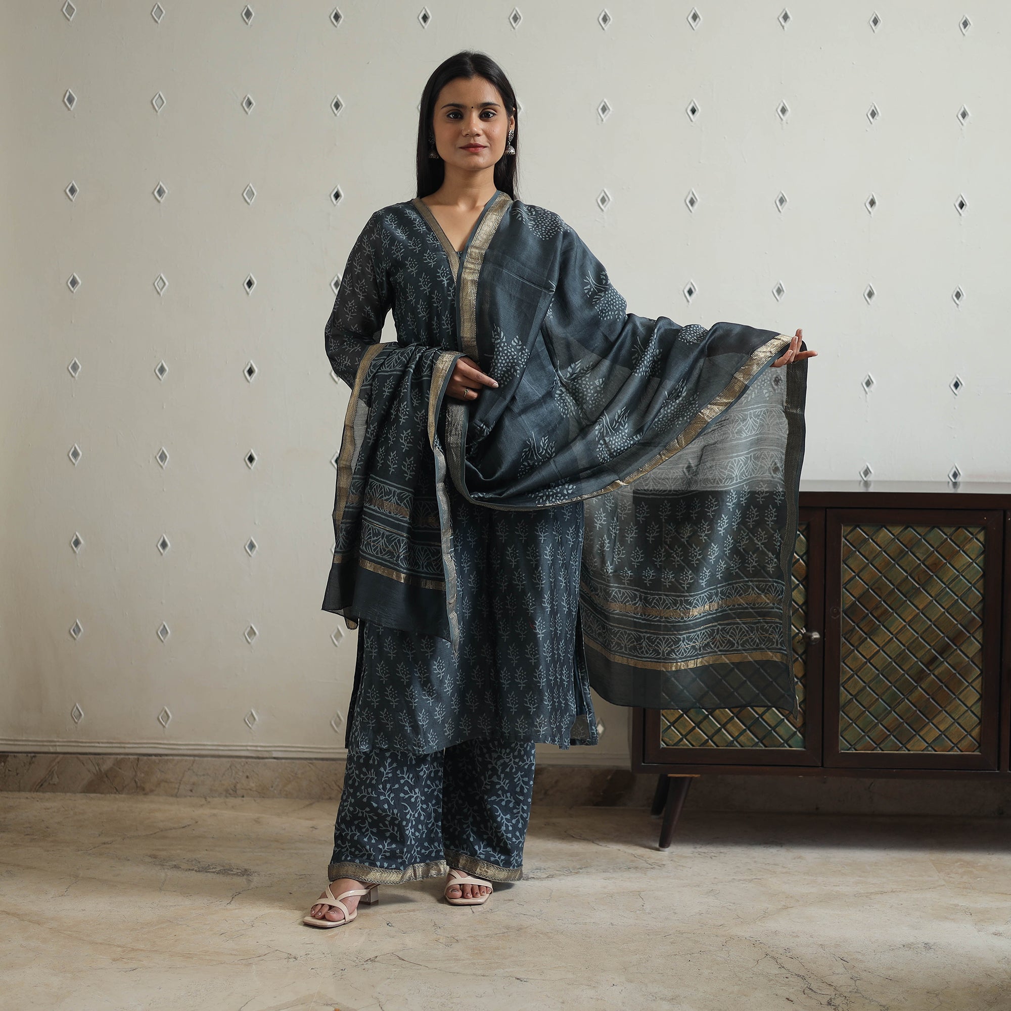 Step up your style with our traditional maheshwari silk bagru print kurta set. This ensemble includes a stylish kurta with one side pocket, comfortable cotton palazzo with an elasticized waist & two side pockets, and a zari-bordered dupatta, all featuring traditional bagru block print motifs. Perfect for festive occasions or casual elegance, this suit reflects timeless artistry.