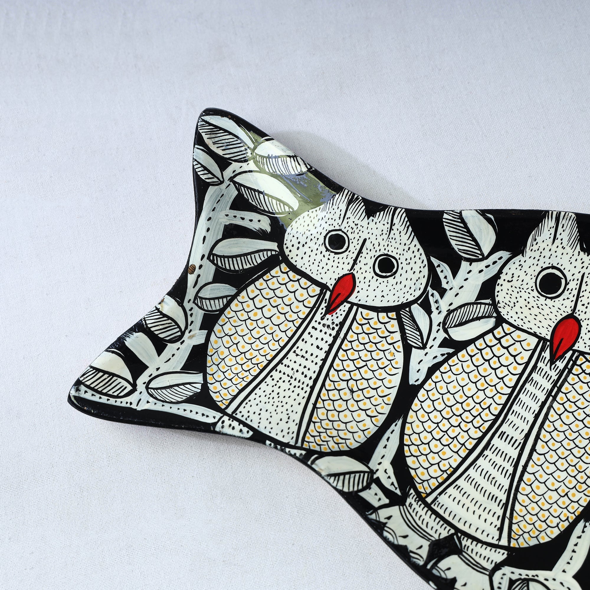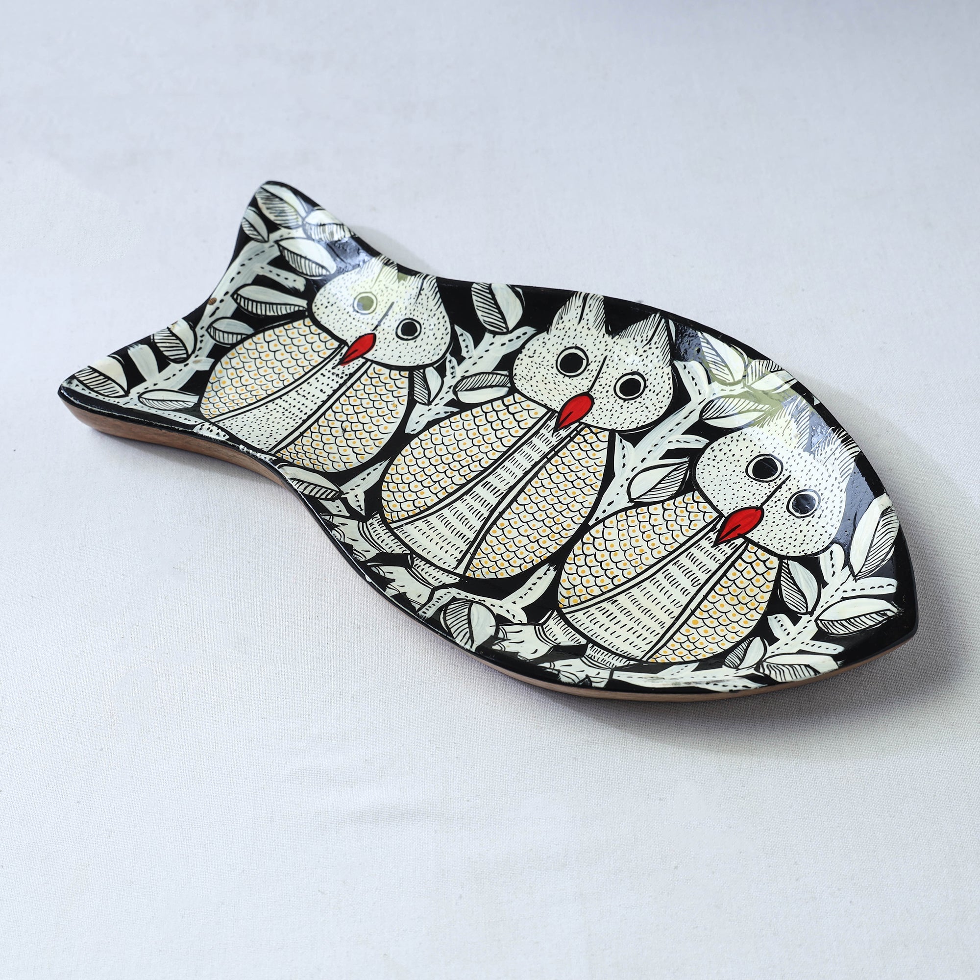 Traditional black pattachitra hand-painted Akashmoni wooden tray crafted in Midnapore by the family of Laltu Chitrakar. This tray features detailed pattachitra artwork made using acrylic colours and permanent ink on an Akashmoni wooden base. Known for its fine detailing, the Pattachitra style often illustrates mythological stories and folktales. The tray can be used for serving snacks or beverages, as a table decor accent, displayed as wall art or chosen as a thoughtful gifting option for art enthusiasts.