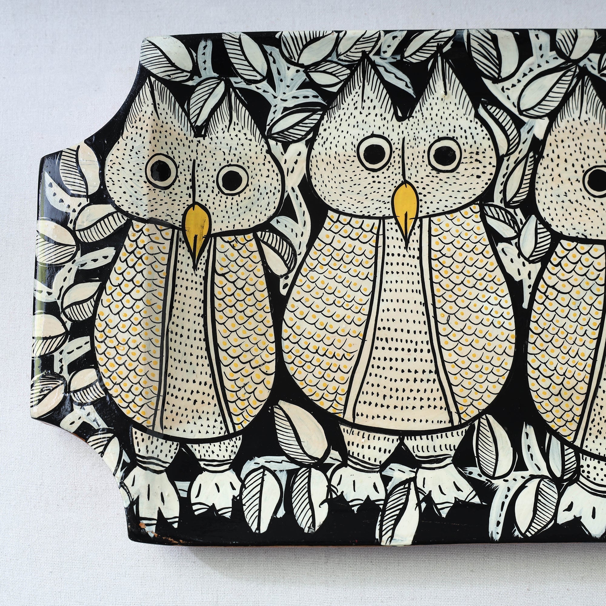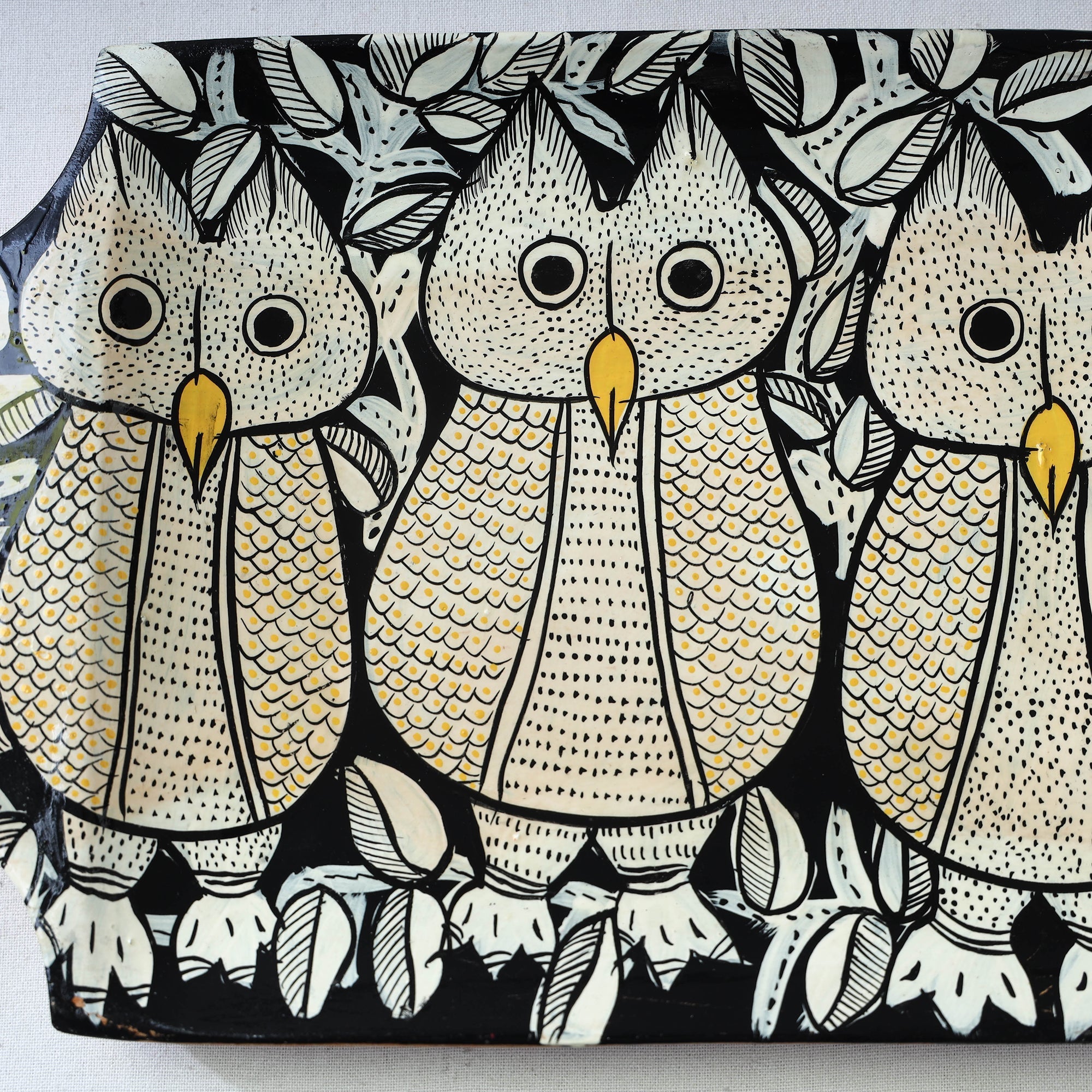 Traditional black pattachitra hand-painted Akashmoni wooden tray crafted in Midnapore by the family of Laltu Chitrakar. This tray features detailed pattachitra artwork made using acrylic colours and permanent ink on an Akashmoni wooden base. Known for its fine detailing, the Pattachitra style often illustrates mythological stories and folktales. The tray can be used for serving snacks or beverages, as a table decor accent, displayed as wall art or chosen as a thoughtful gifting option for art enthusiasts.