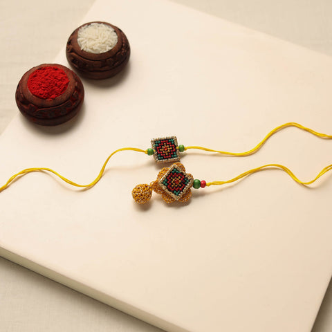 Celebrate the bond of sibling love with our tribal hand-embroidered rakhi and lumba set. Crafted by skilled artisans, each piece is more than just a thread, it's a heartfelt symbol of affection and tradition. Perfect for making your Raksha Bandhan truly special.