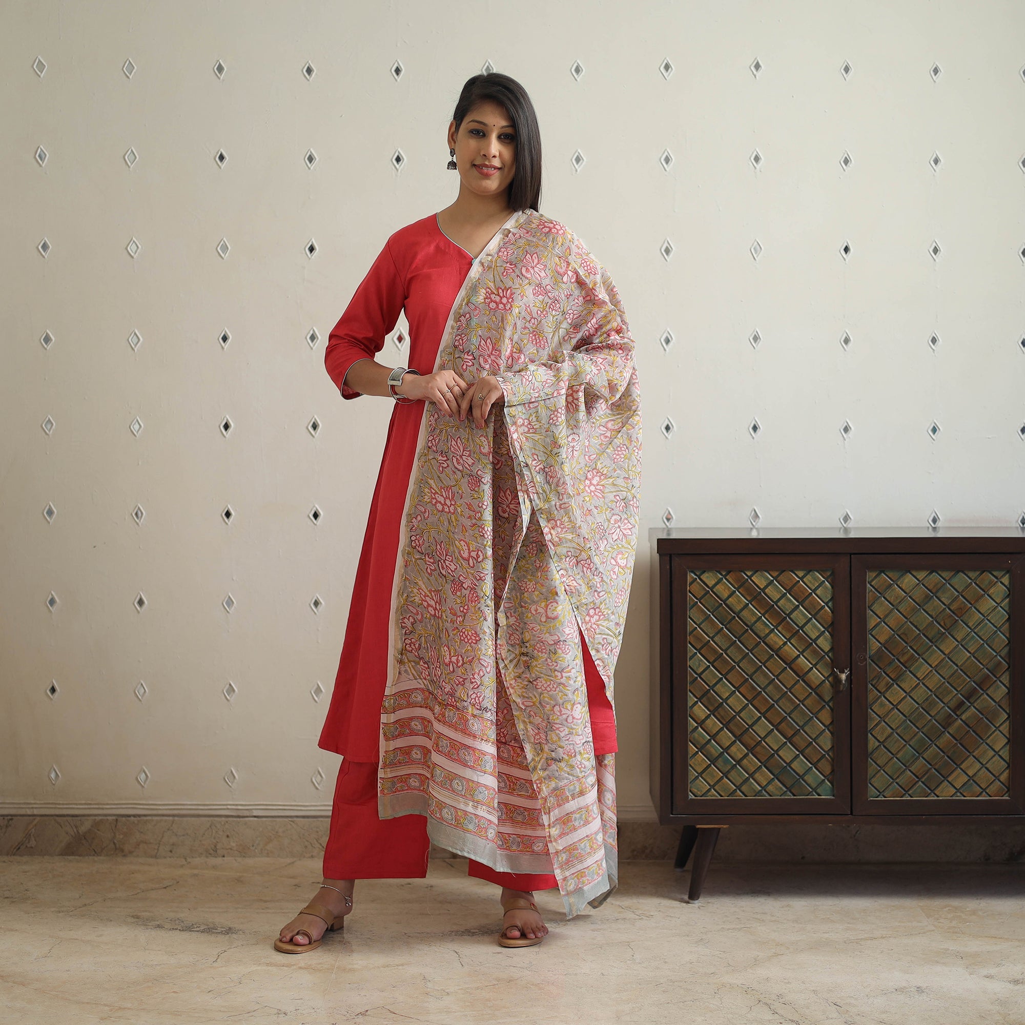 Experience effortless style with this grey bhagalpuri linen cotton plain kurta set, featuring a side-pocket kurta and elastic-waist palazzo with pockets. Paired with a sanganeri chanderi silk dupatta, this eco-friendly ensemble blends comfort with tradition. Lightweight and versatile, it’s perfect for casual outings or festive occasions.