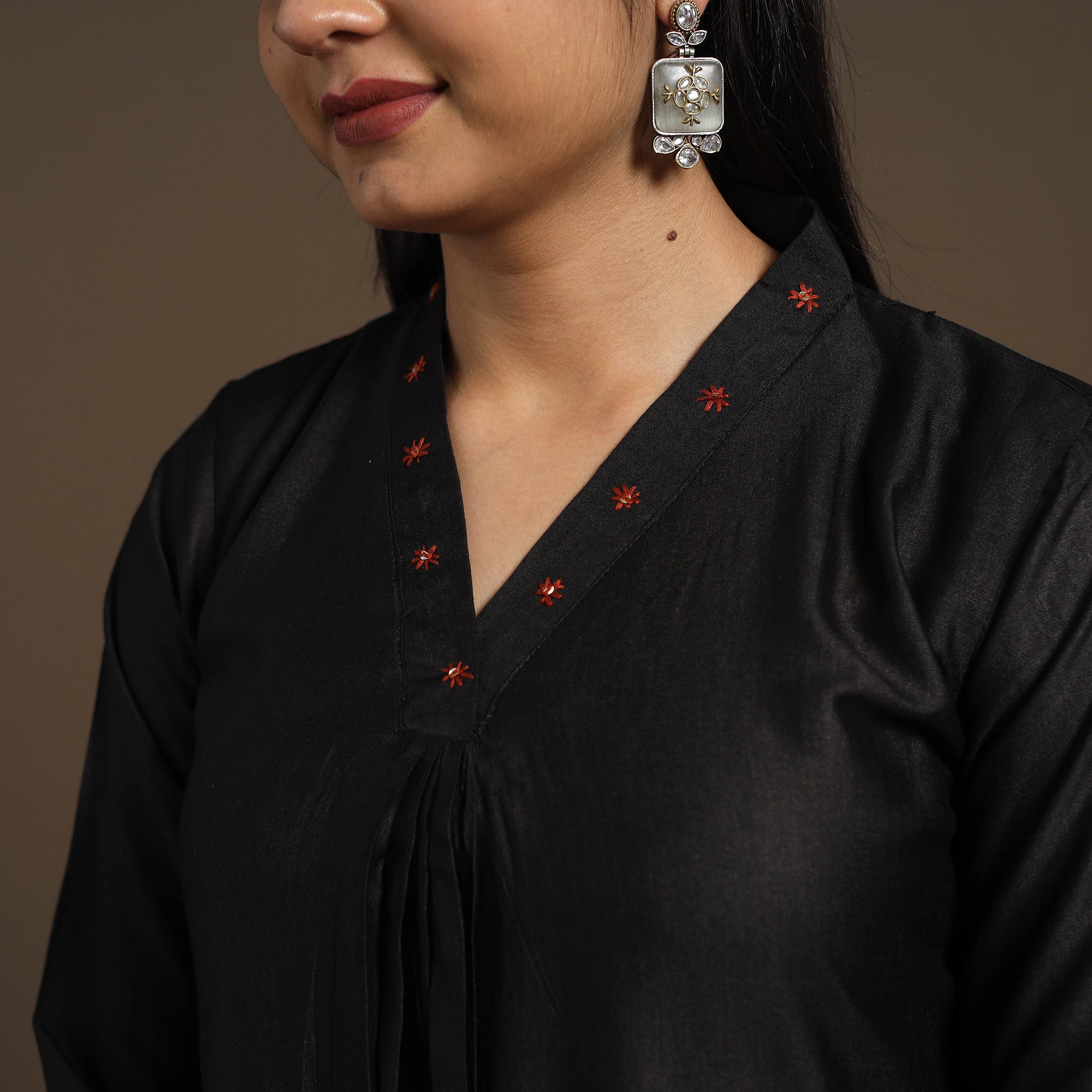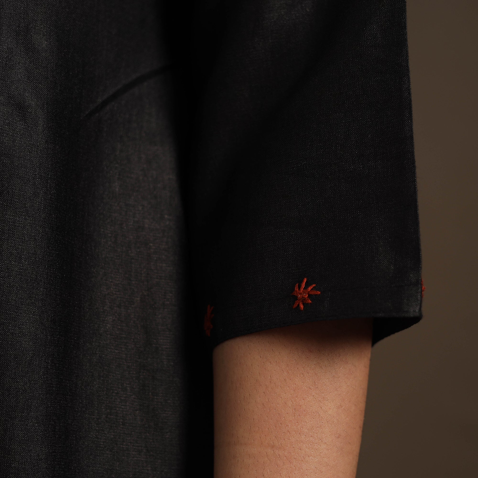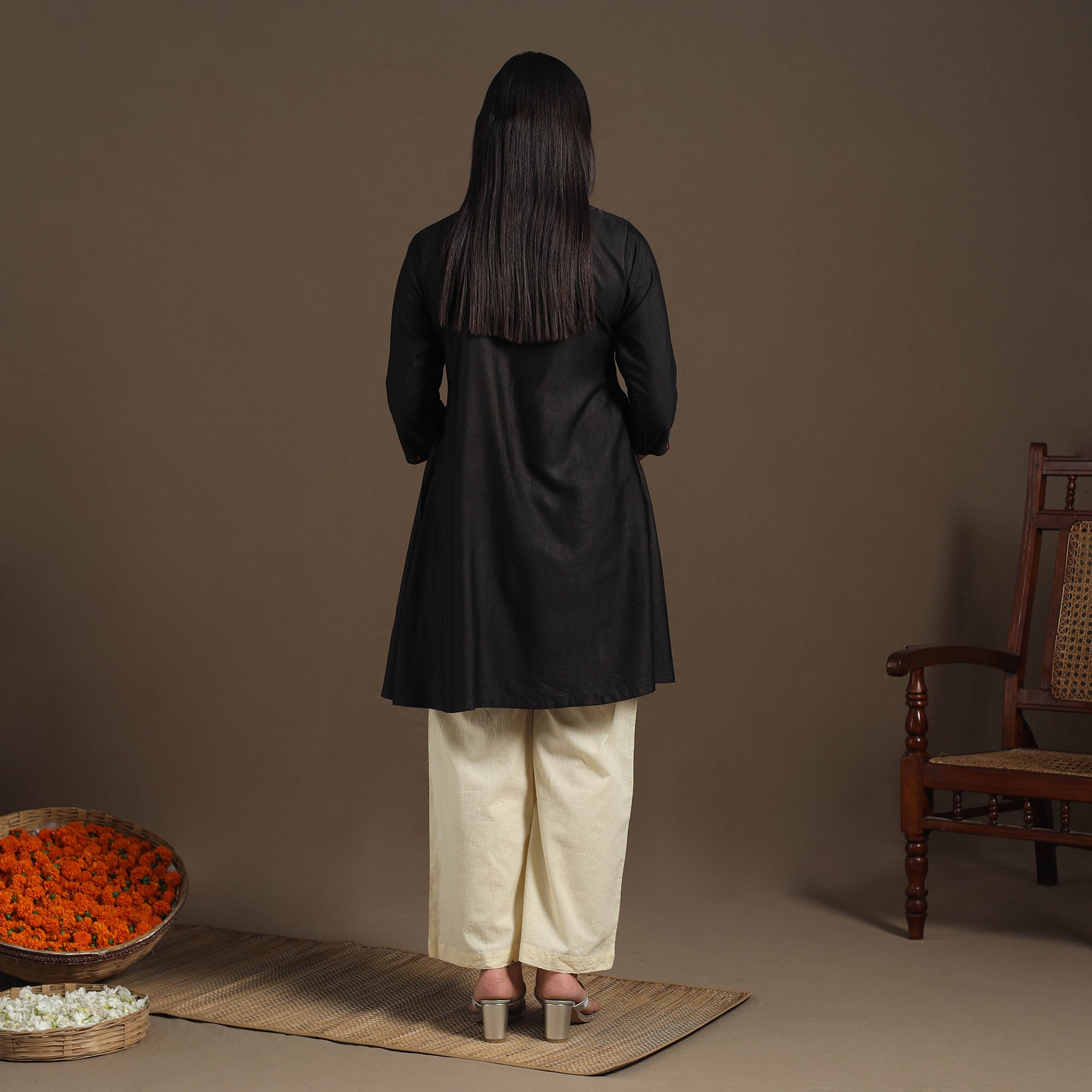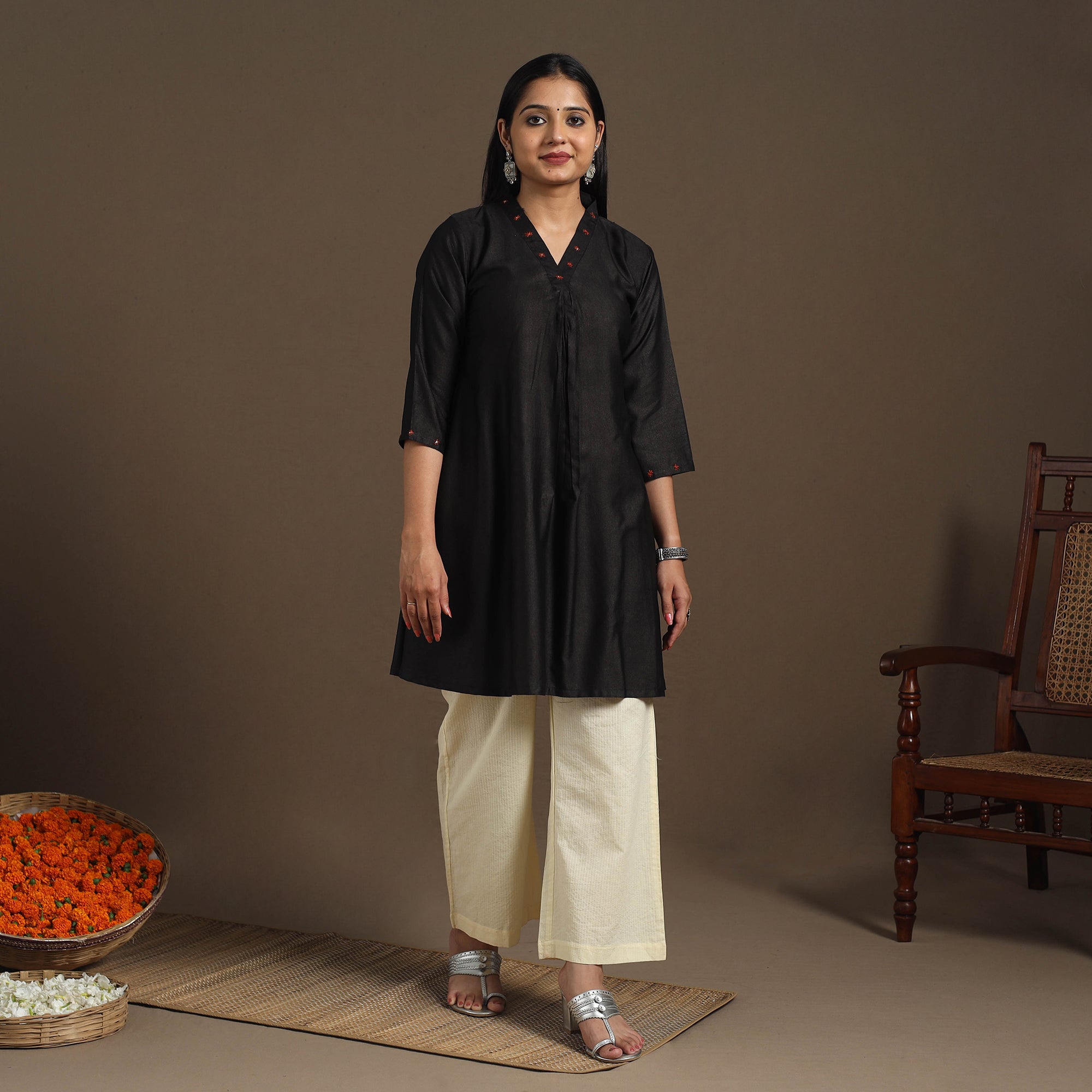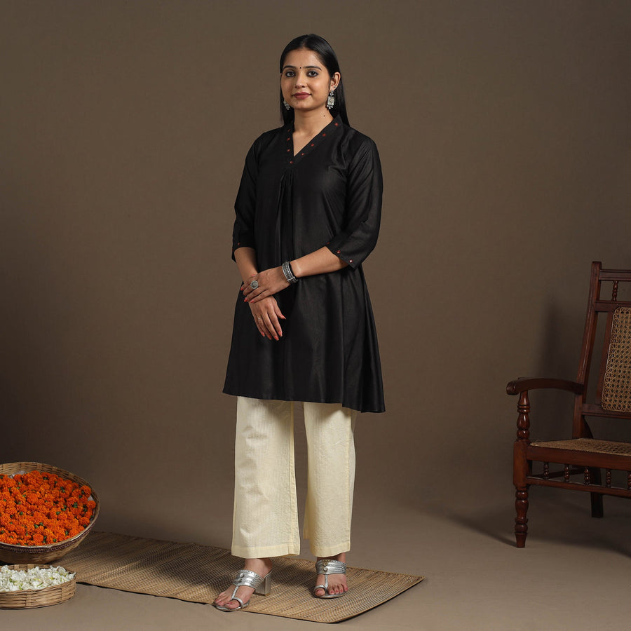 This black short plain kurta is crafted from handloom tussar silk cotton, a fabric known for blending the graceful sheen of silk with the breathable comfort of cotton. The weave adds an elegant touch, making it suitable for all-weather wear. Thoughtfully placed embroidery elevates the overall look, adding charm to the handwoven fabric. Ideal for office wear, daily styling, festive layering, or casual meet-ups.