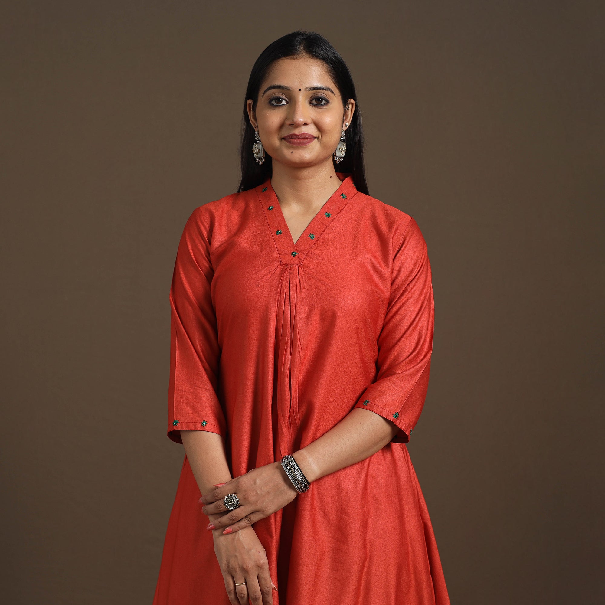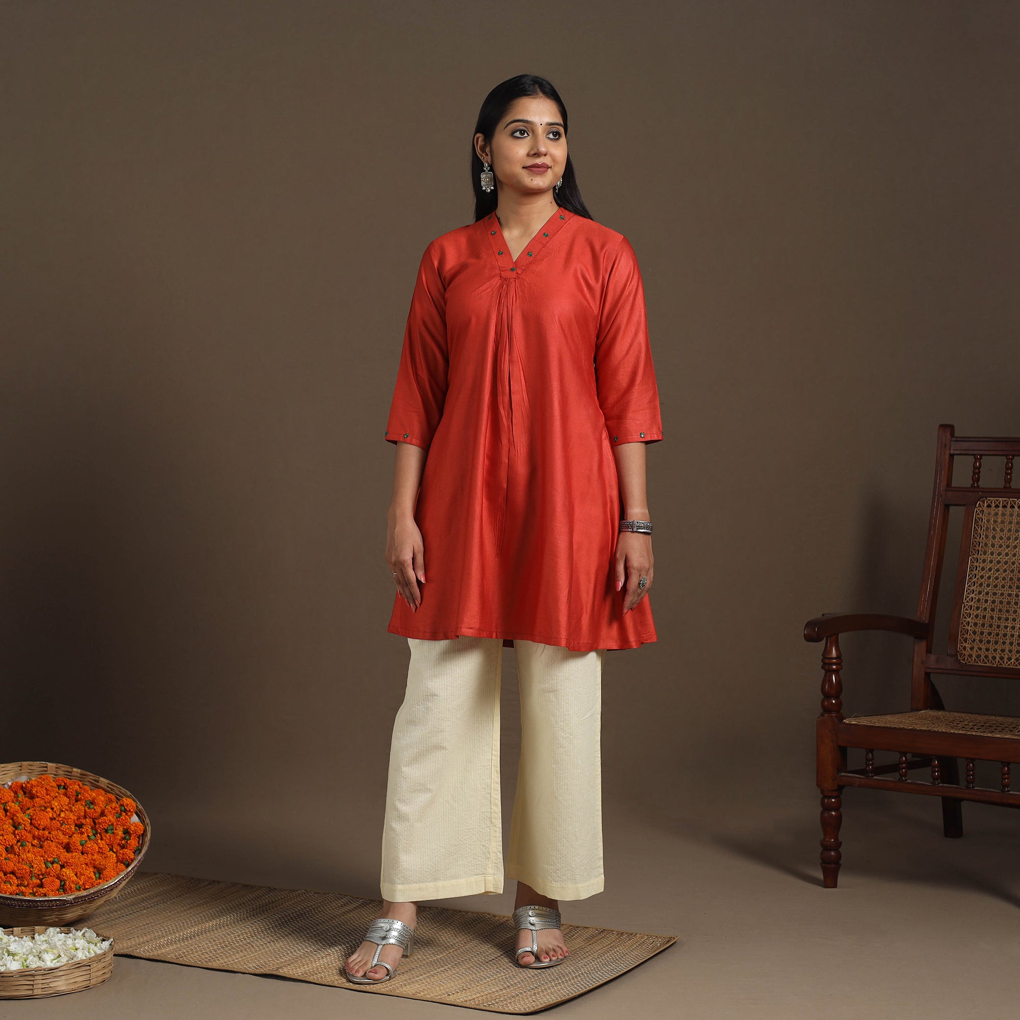 This red short plain kurta is crafted from handloom tussar silk cotton, a fabric known for blending the graceful sheen of silk with the breathable comfort of cotton. The weave adds an elegant touch, making it suitable for all-weather wear. Thoughtfully placed embroidery elevates the overall look, adding charm to the handwoven fabric. Ideal for office wear, daily styling, festive layering, or casual meet-ups.