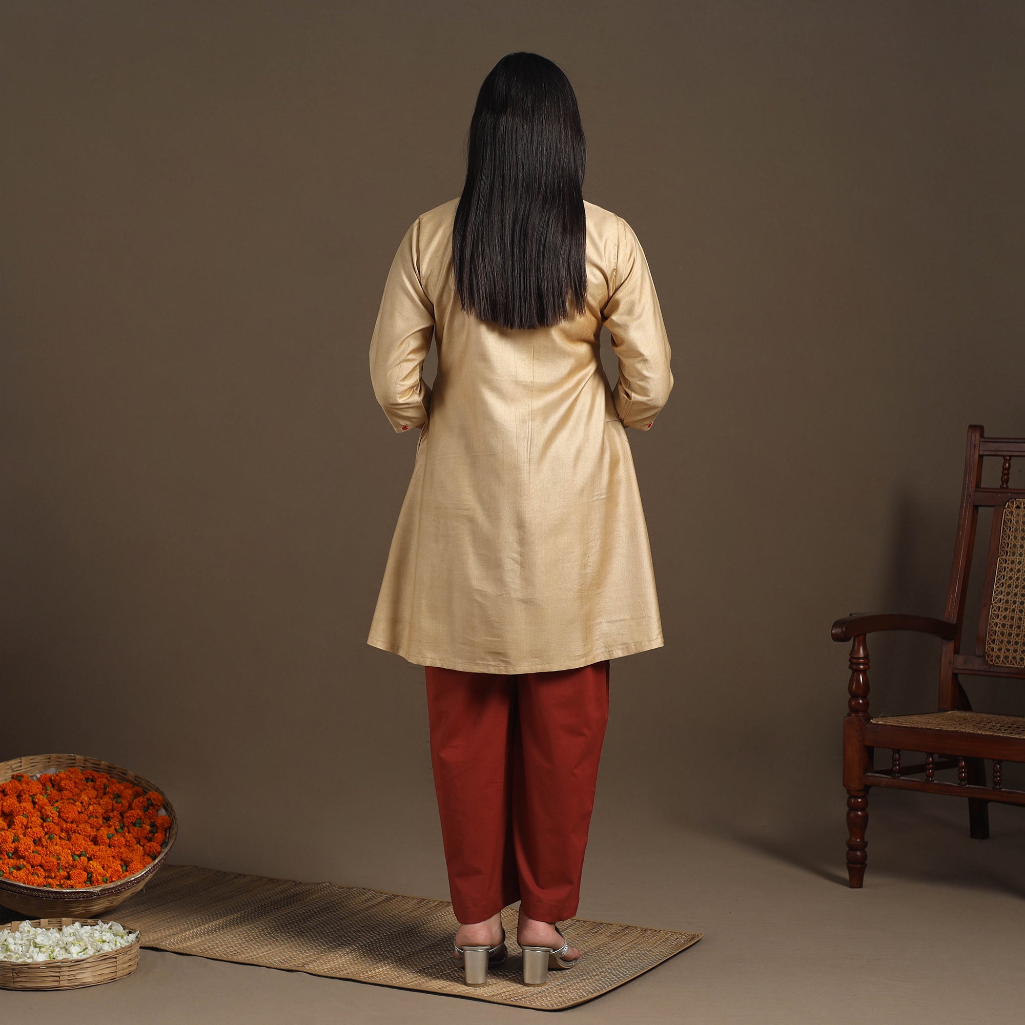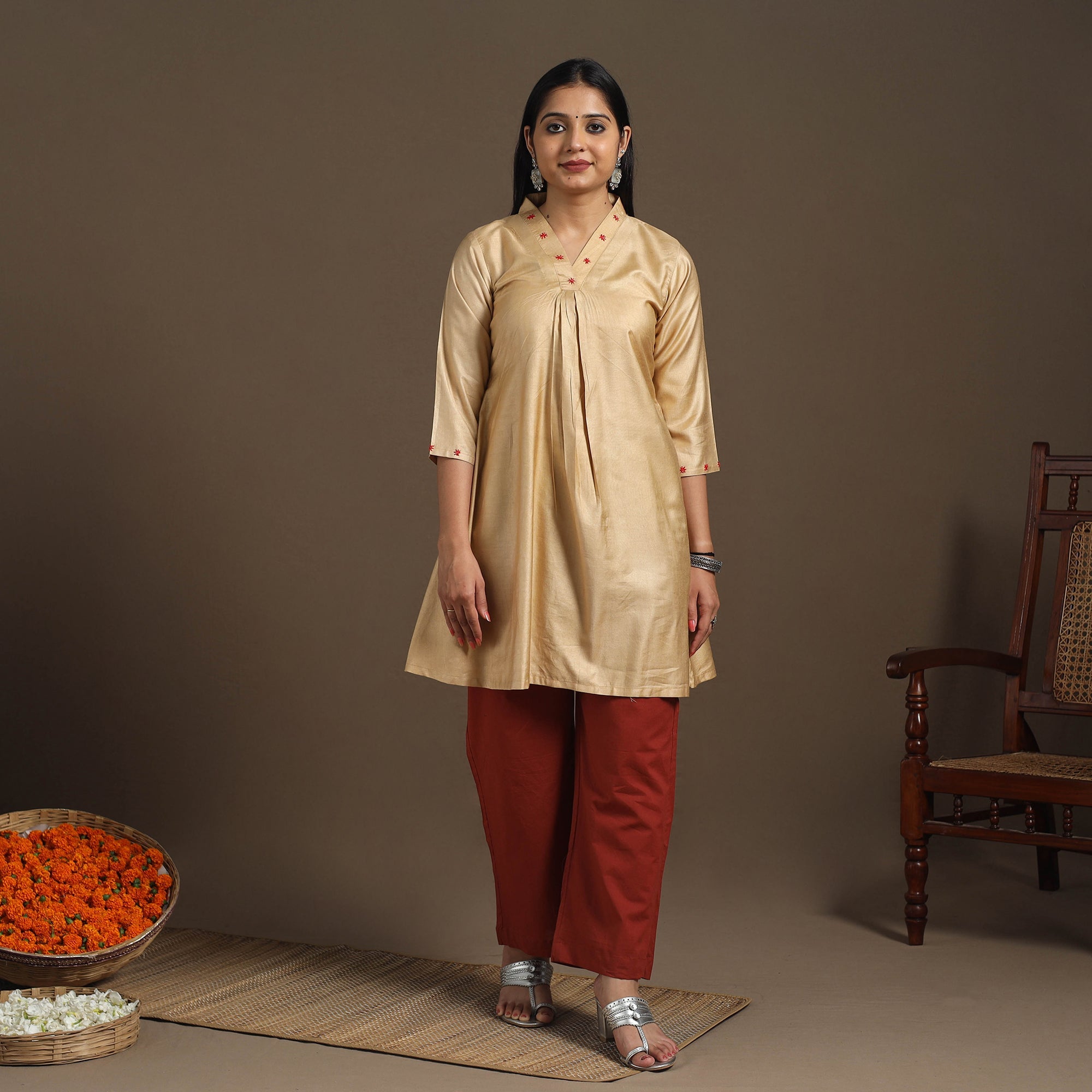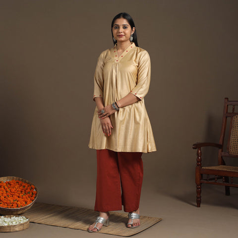This beige short plain kurta is crafted from handloom tussar silk cotton, a fabric known for blending the graceful sheen of silk with the breathable comfort of cotton. The weave adds an elegant touch, making it suitable for all-weather wear. Thoughtfully placed embroidery elevates the overall look, adding charm to the handwoven fabric. Ideal for office wear, daily styling, festive layering, or casual meet-ups.