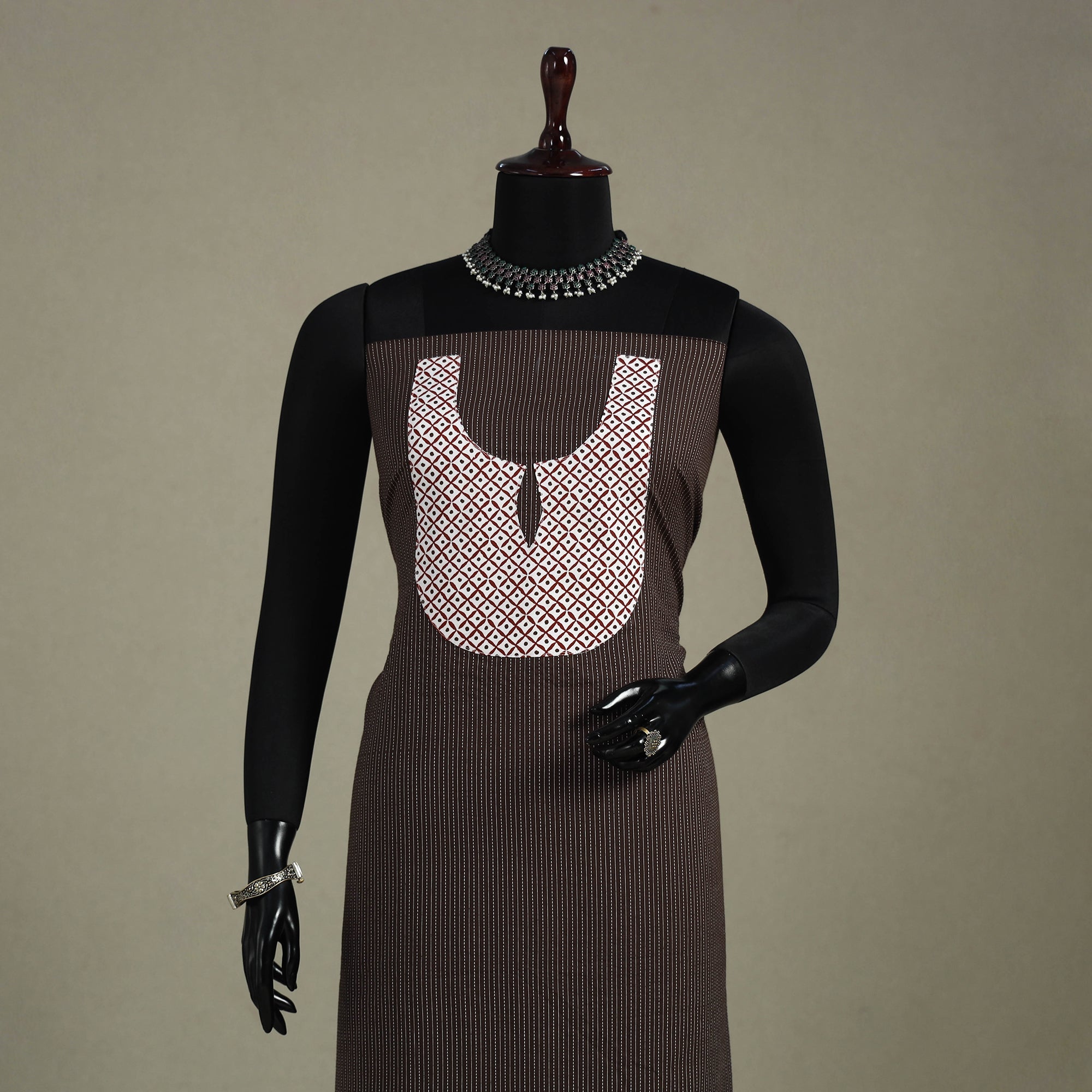 This brown plain cotton kurta material is crafted for everyday ease with a subtle artisanal flair. It features delicate running-stitch work and a patchwork detail at the neckline, adding a hint of handcrafted elegance. Ideal for making daily-wear kurtas, office attire, or laid-back casual looks.