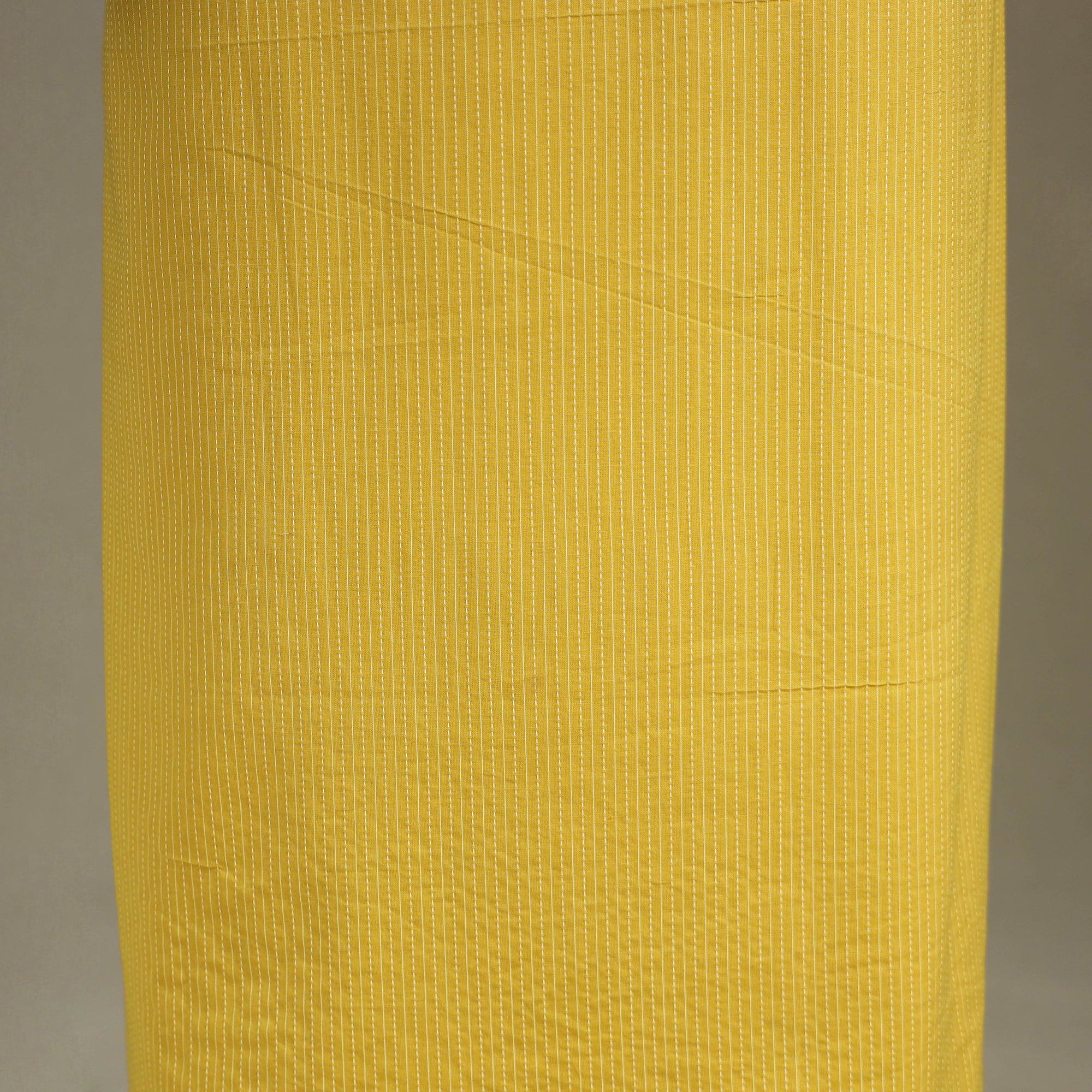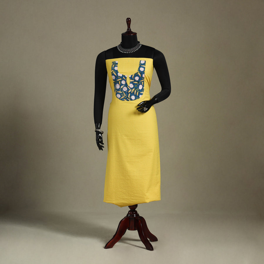 This yellow plain cotton kurta material is crafted for everyday ease with a subtle artisanal flair. It features delicate running-stitch work and a patchwork detail at the neckline, adding a hint of handcrafted elegance. Ideal for making daily-wear kurtas, office attire, or laid-back casual looks.