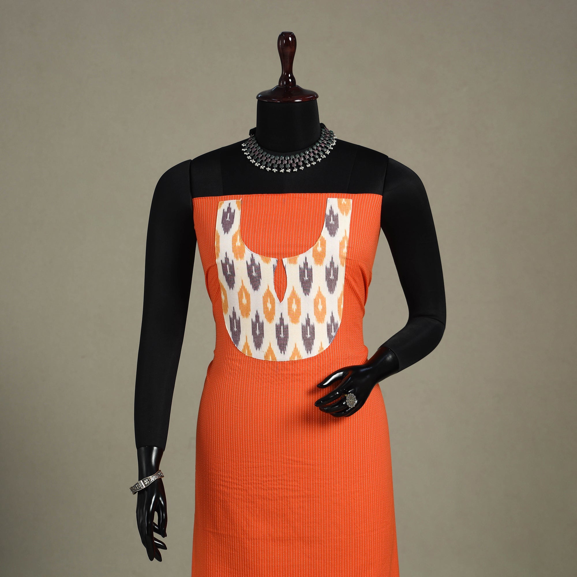 This orange plain cotton kurta material is crafted for everyday ease with a subtle artisanal flair. It features delicate running-stitch work and a patchwork detail at the neckline, adding a hint of handcrafted elegance. Ideal for making daily-wear kurtas, office attire, or laid-back casual looks.